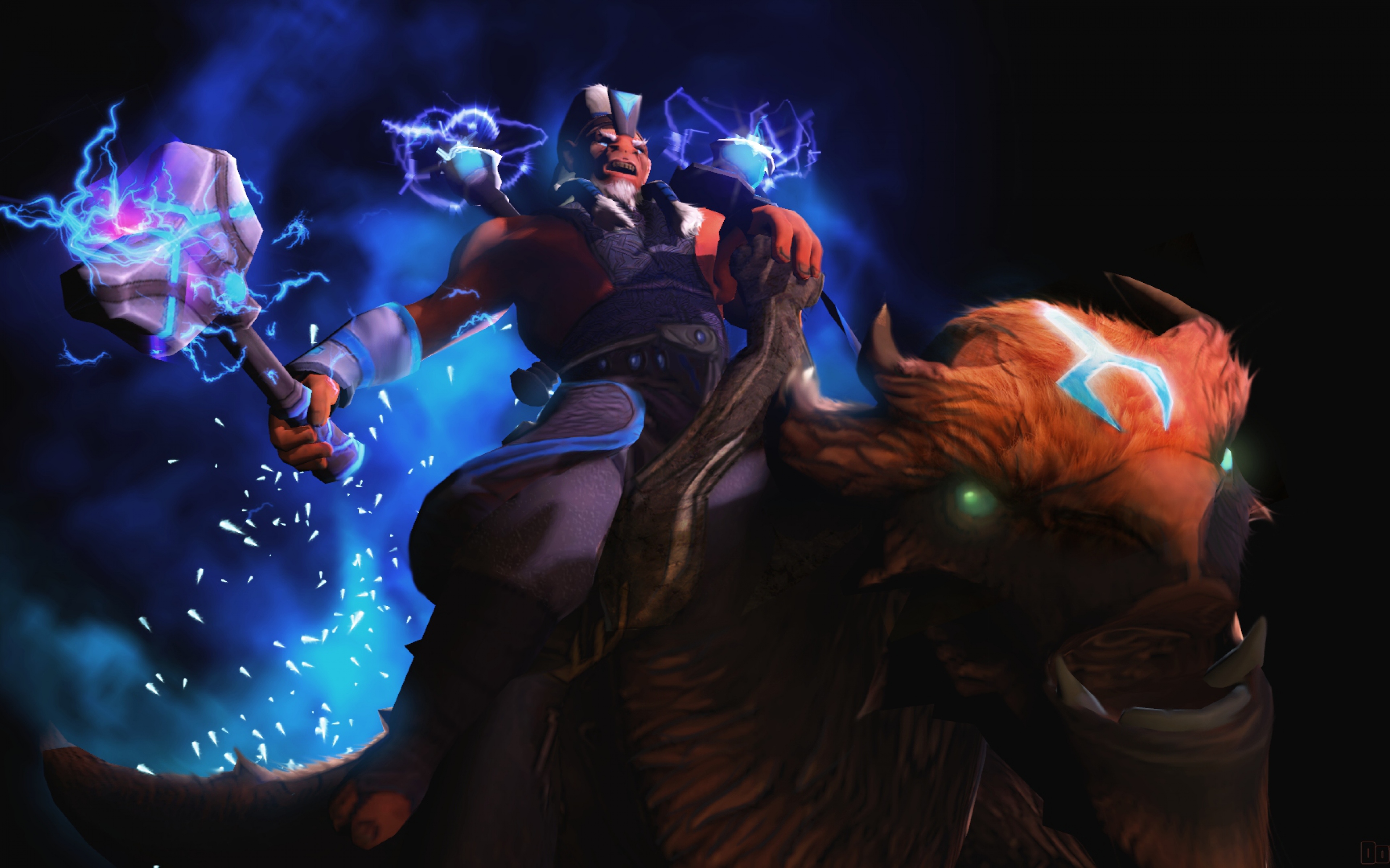 Description: A man riding on the back of a brown animal with glowing eyes and a hammer in his hand.