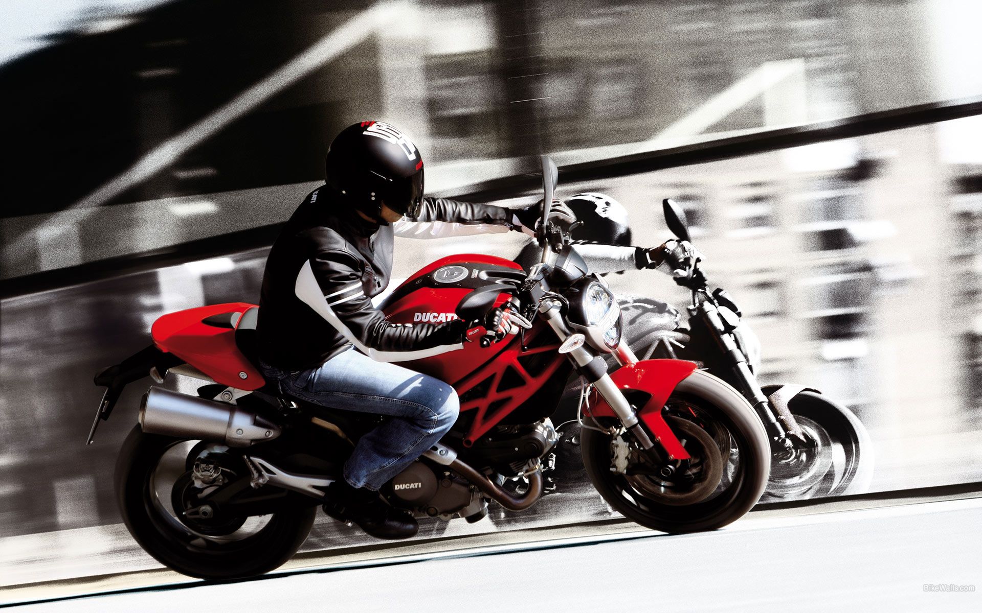 Description: A man riding a red motorcycle down a street next to a tall building with a black helmet on it.