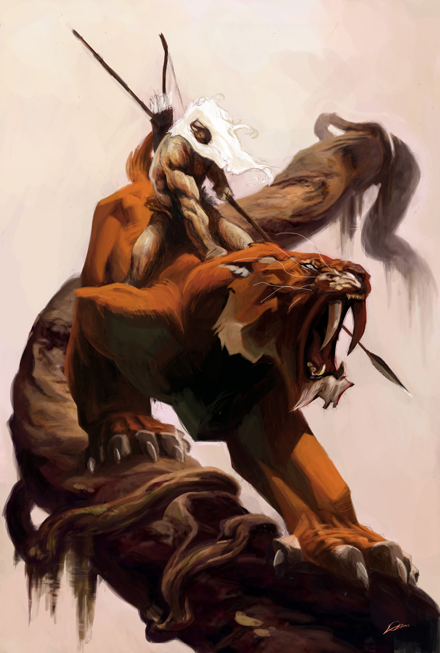 Description: A painting of a man riding a tiger on a rock with a sword in his hand and a demon on his back.