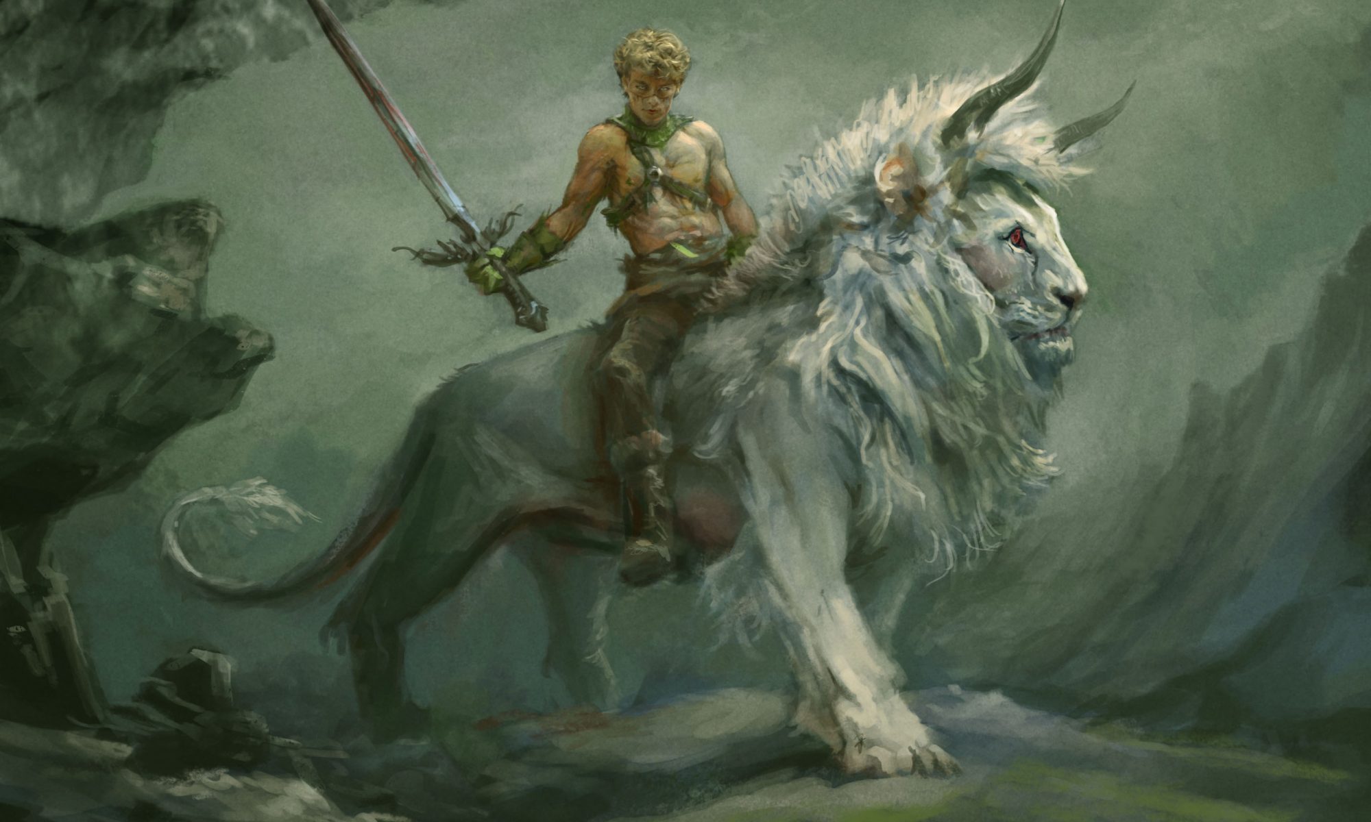 Description: A man riding on the back of a white lion next to a sword and a demon on a rock.