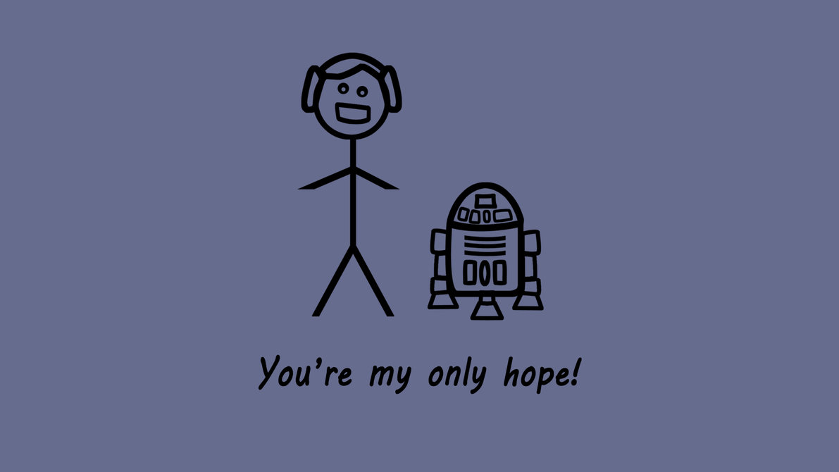 Description: A drawing of a man with a robot next to him that says you're my only hope on a blue background.