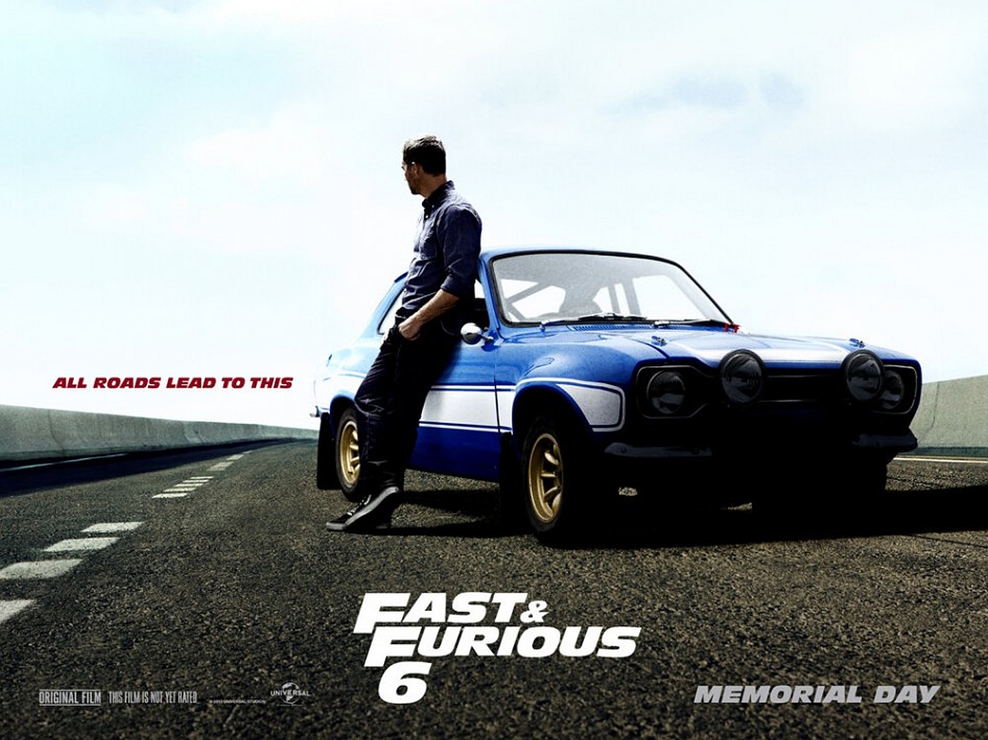 Description: A man sitting on the hood of a blue car on a road with a sky background and a text that reads fast and fabulous.