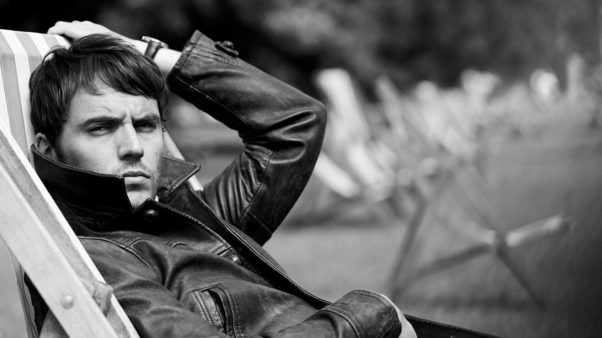 Description: A man sitting in a chair with his head in his hands and a jacket on his shoulders.