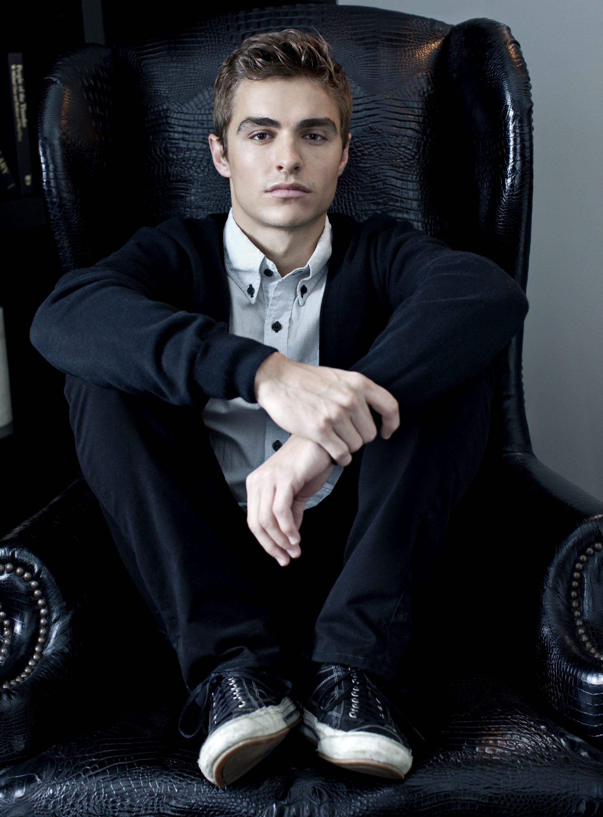 Description: A man sitting in a chair with his legs crossed and his hand on his knees.