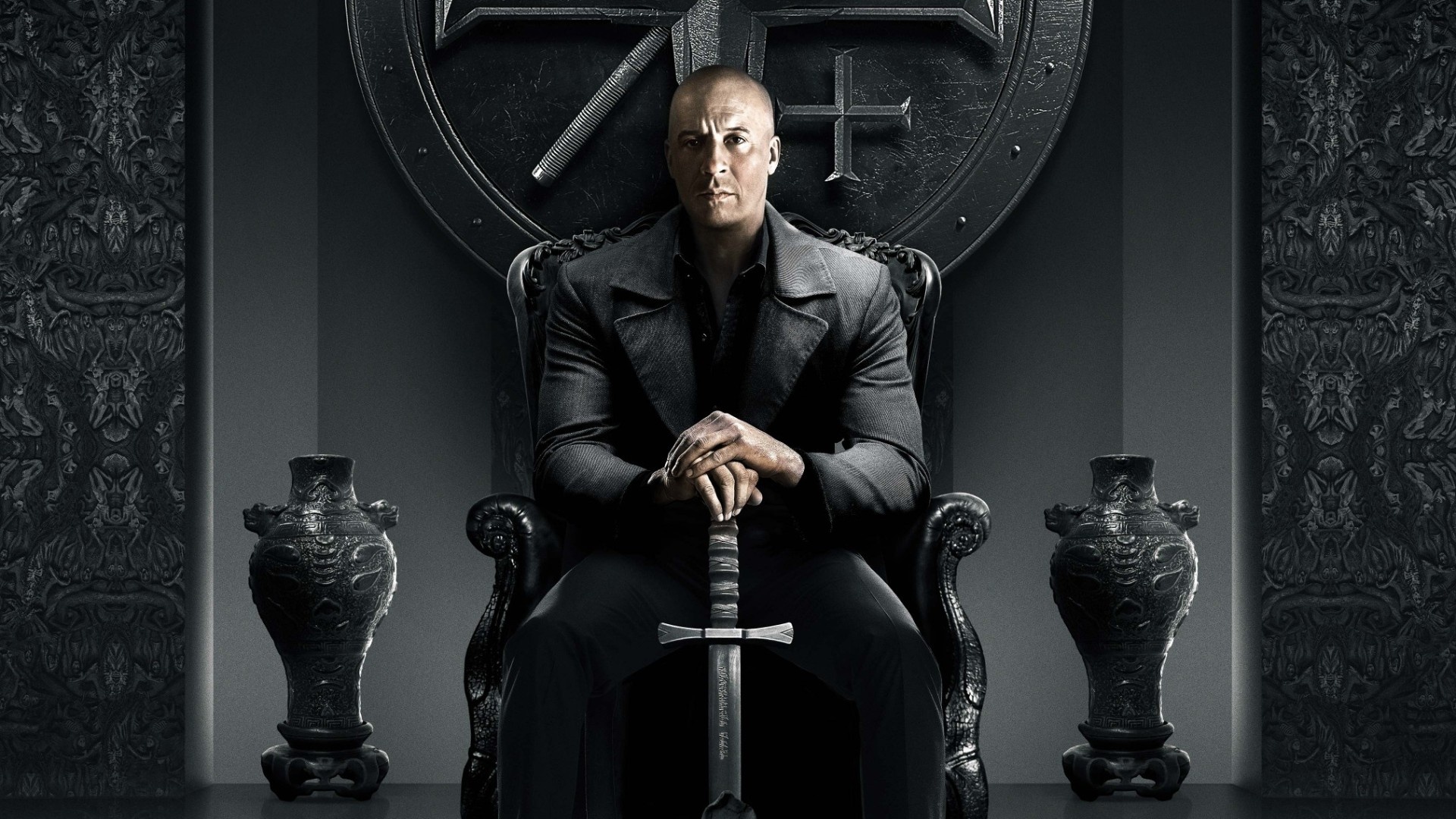 Description: A man sitting in a chair with a sword in his hand and a shield behind him with the letter h on it.
