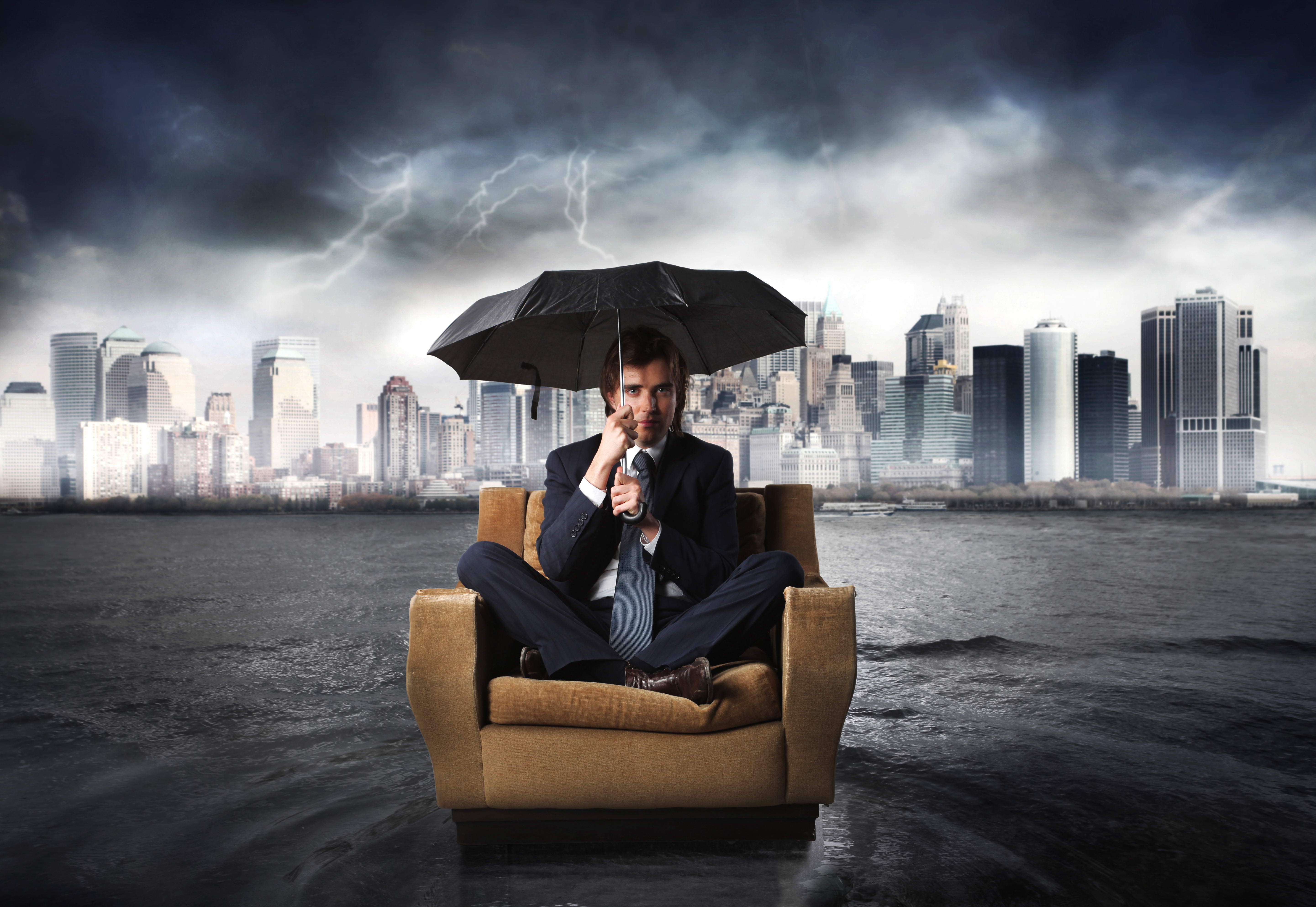 Description: A man sitting in a chair with an umbrella over his head and a city in the background with a storm.