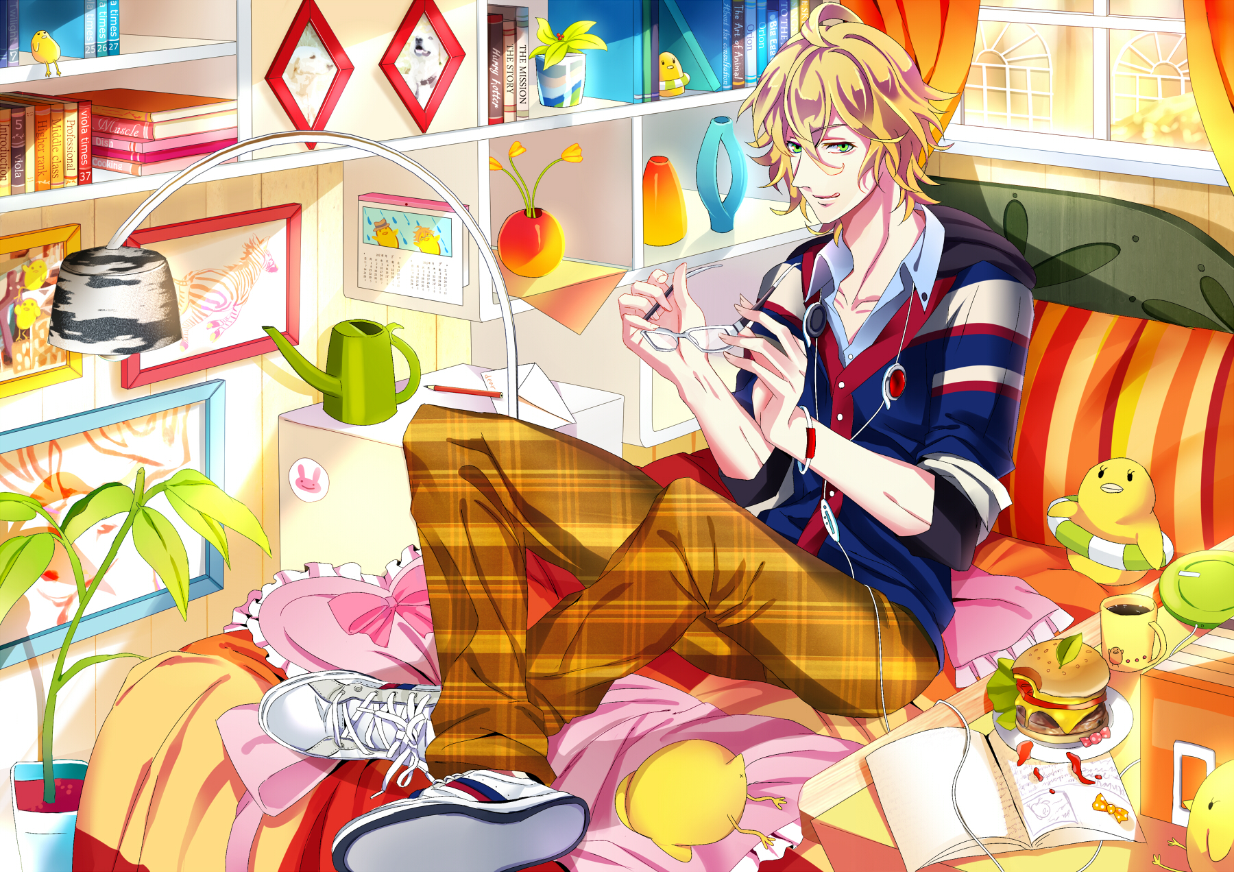 Description: A man sitting on a couch in a room with a book and a cup of coffee in his hand.