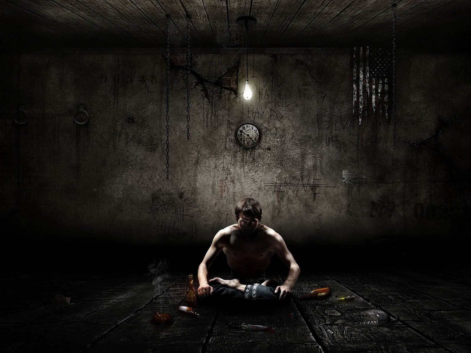 Description: A man sitting on the floor in a dark room with a clock on the wall behind him and a cigarette in his hand.