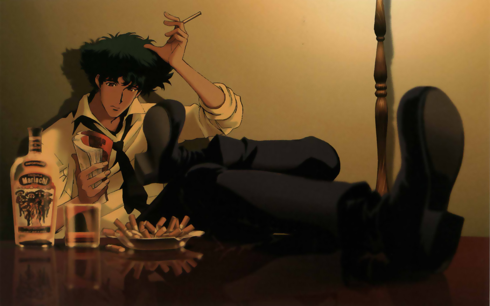 Description: A man sitting on the floor with a cigarette in his hand and a bottle of alcohol in his other hand.