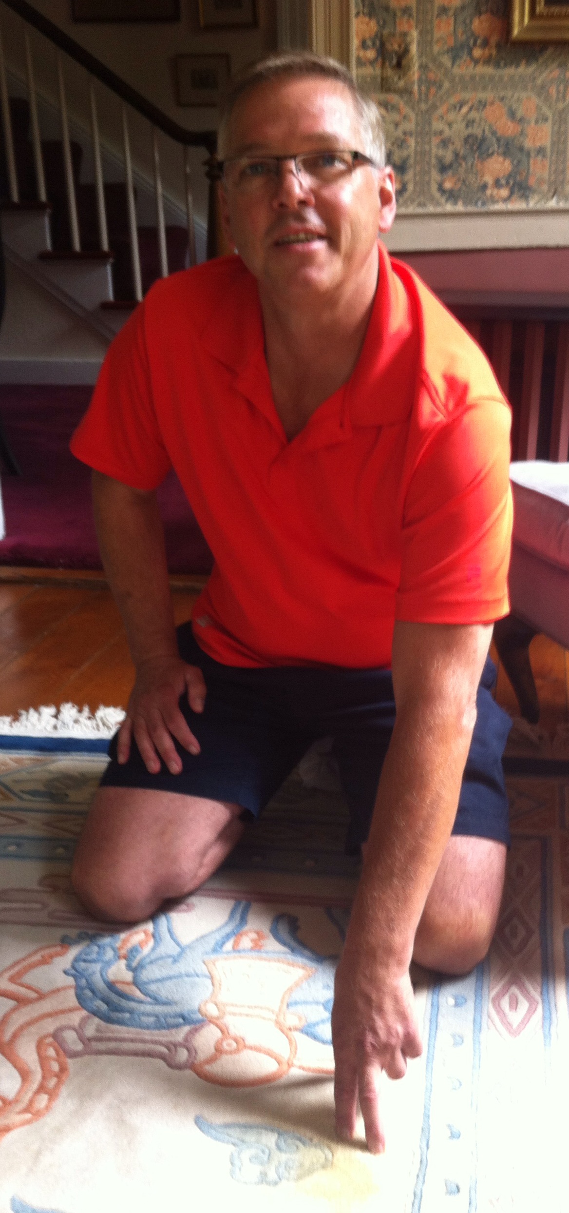 Description: A man sitting on the floor in front of a rug with a dragon design on it and a stair case behind him.