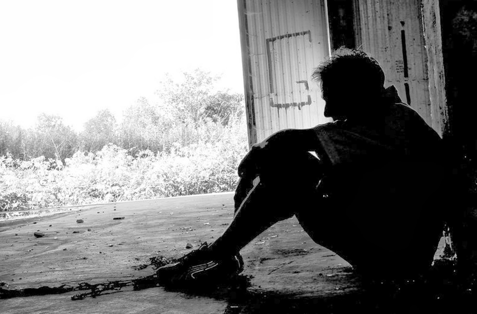 Description: A man sitting on the ground next to a building with a door and a chain hanging from it's side.