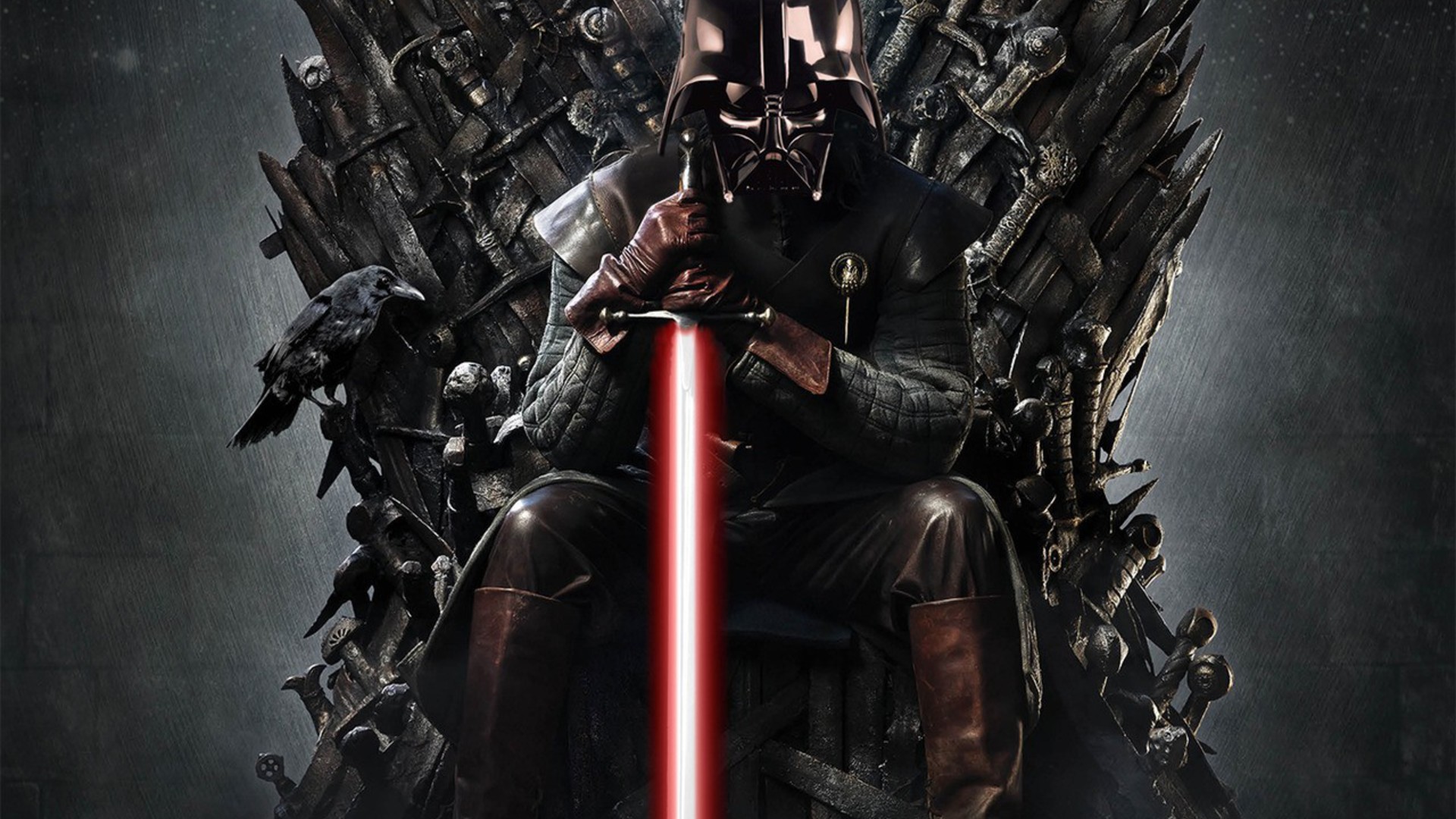 Description: A man sitting on a iron throne with a sword in his hand and a helmet on his head.