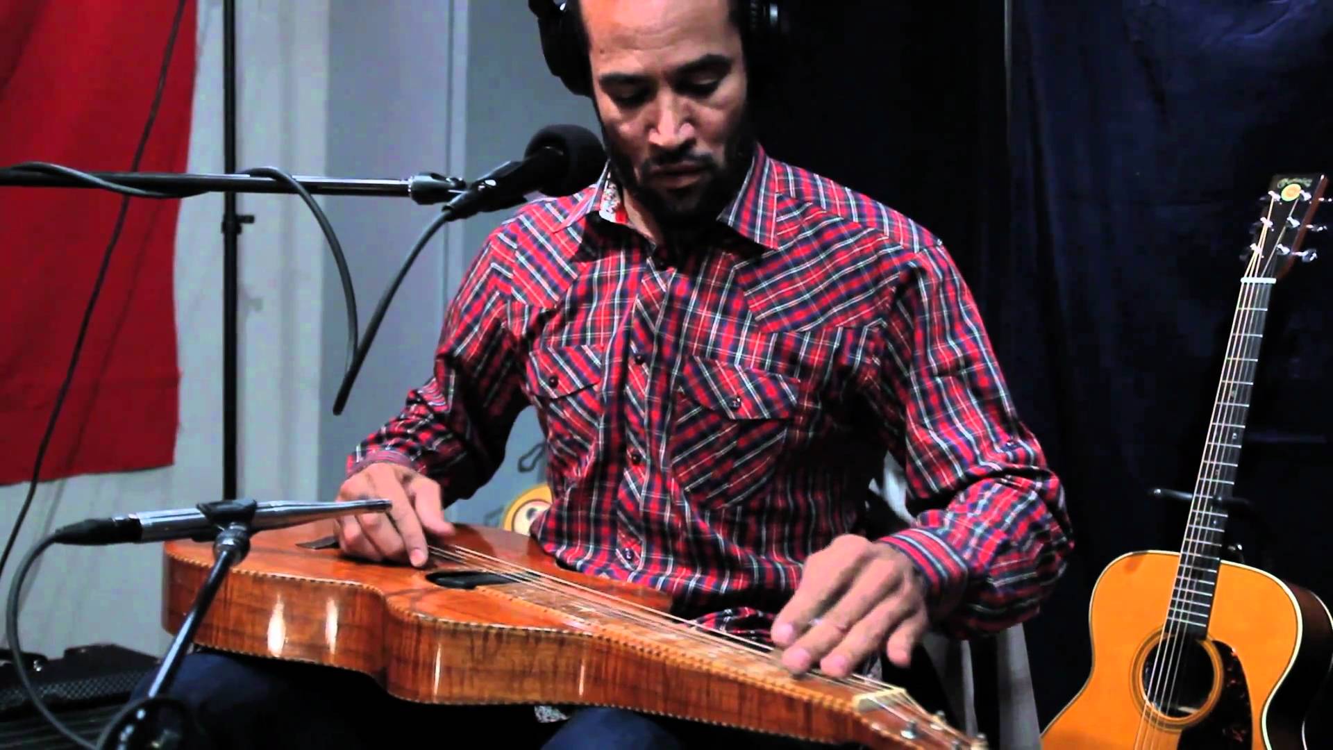 Description: A man sitting in front of a microphone playing a guitar with headphones on his ears and a microphone in front of him.