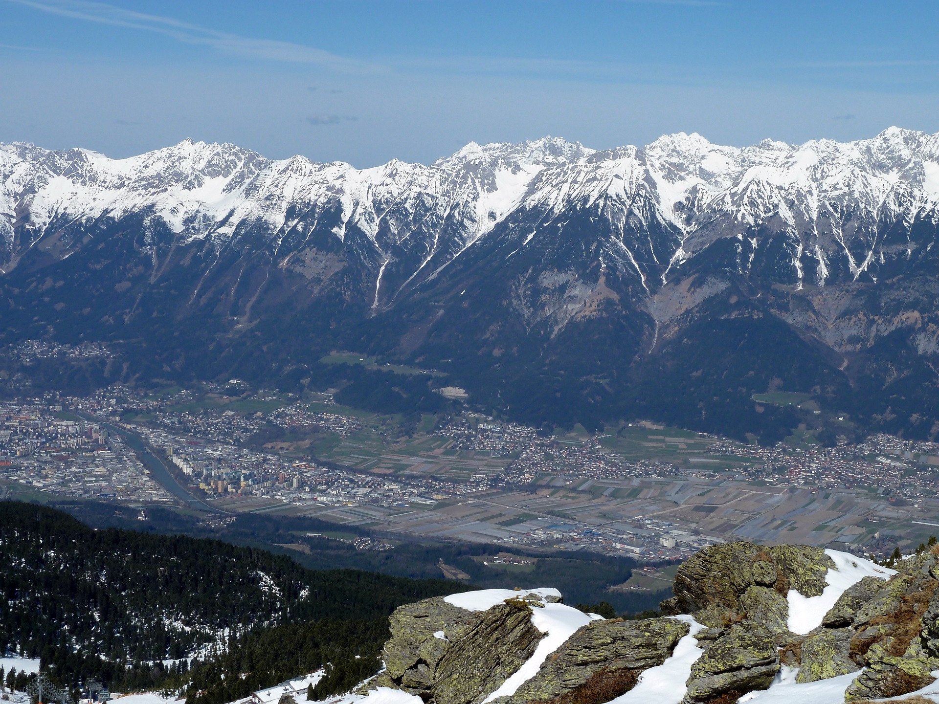 Description: A man sitting on top of a mountain with a view of a town below him and snow covered mountains in the background.