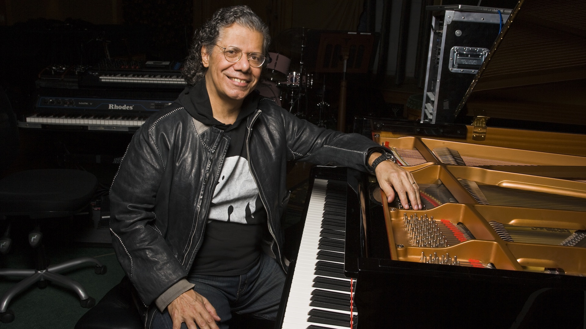 Description: A man sitting at a piano in a room with a piano and a chair in front of him and a piano behind him.
