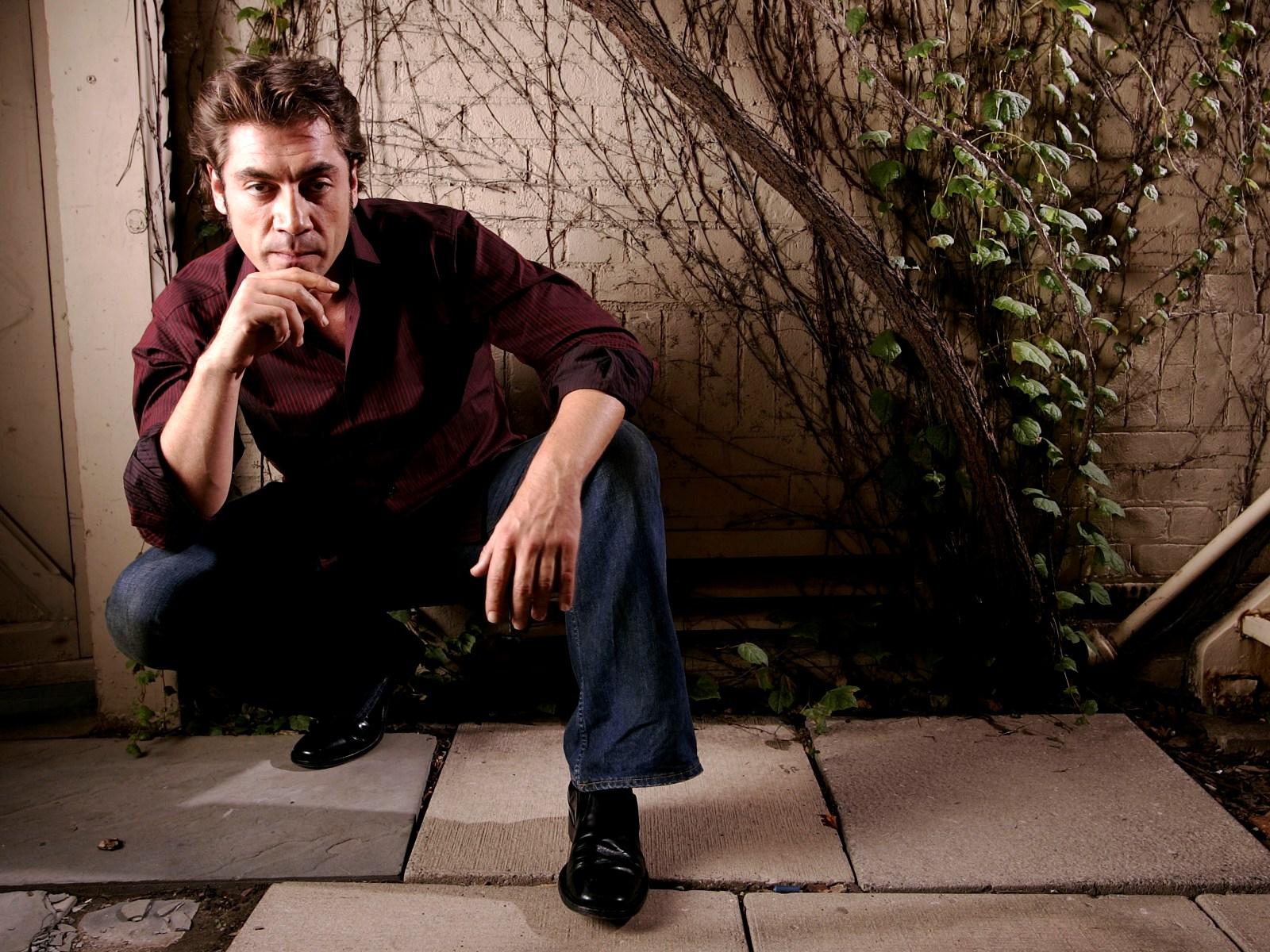 Description: A man sitting on a tiled floor next to a plant covered wall and a doorway with a door way.