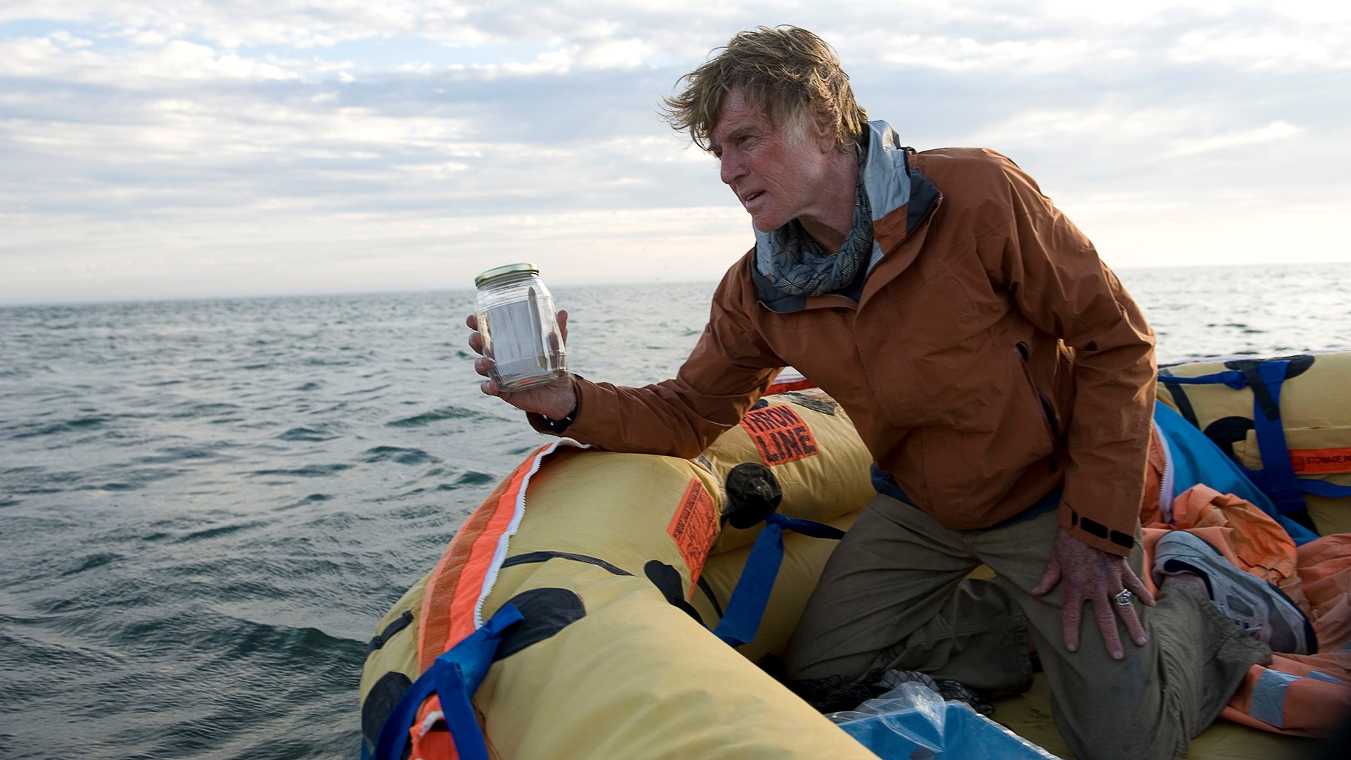 Description: A man sitting on a raft looking at a cell phone while holding a can of beer in his hand.
