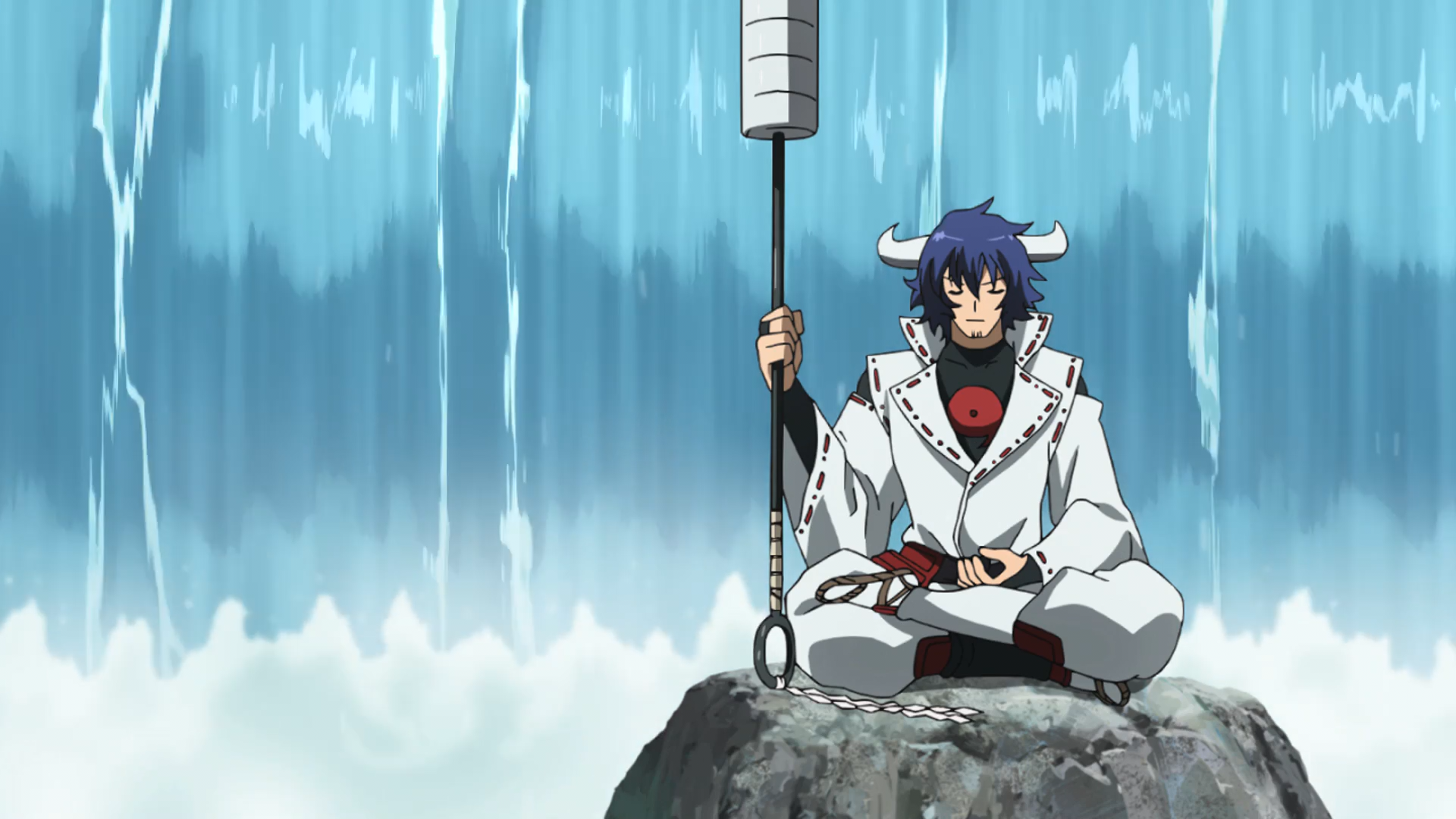 Description: A man sitting on top of a rock holding a pole in his hand and a bull on his shoulder.