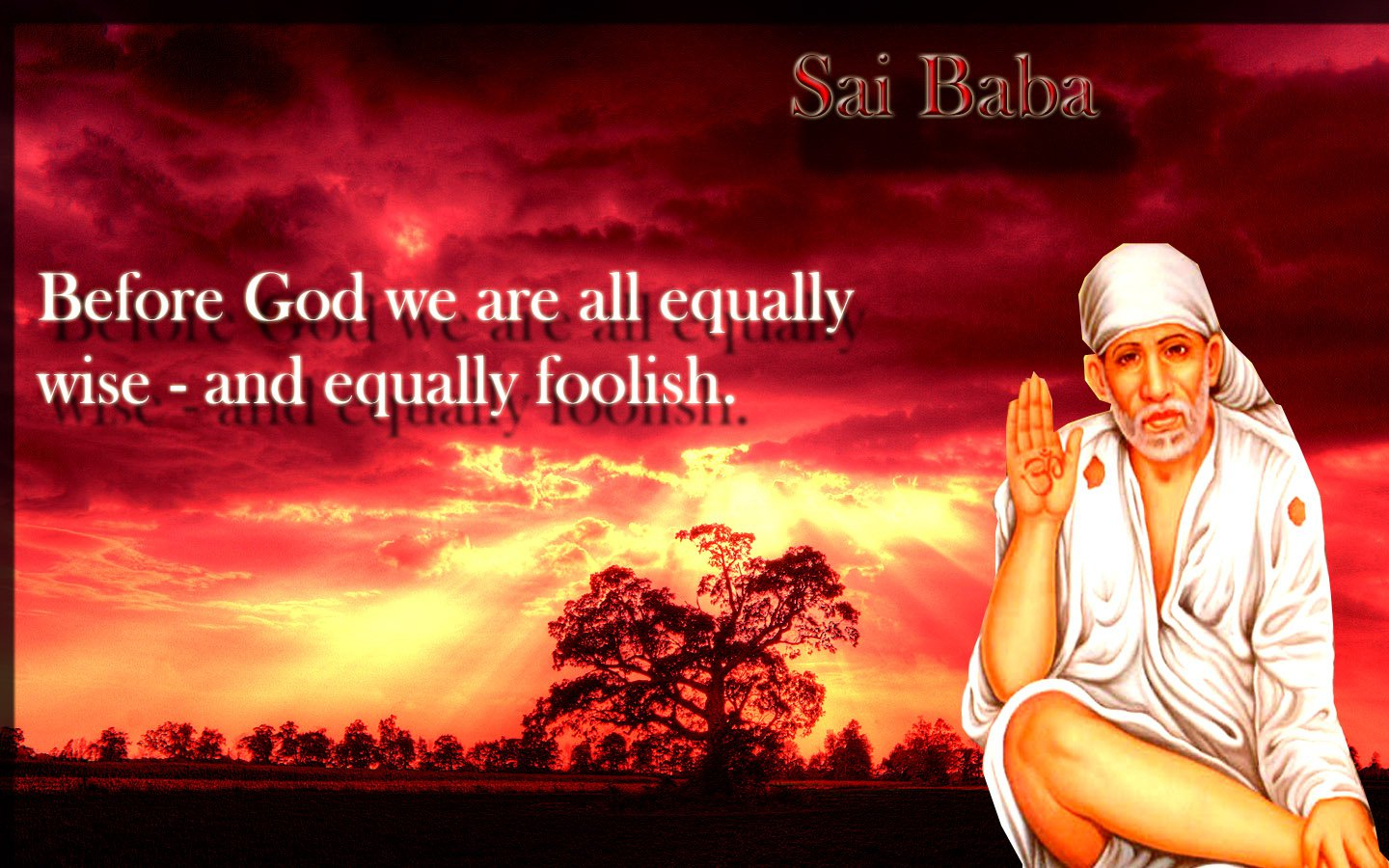 Description: A painting of a man sitting on a rock with a sunset behind him and a quote from sai baba.