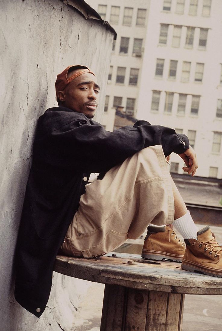 Description: A man sitting on a table with his feet up against a wall and wearing a jacket and hat.