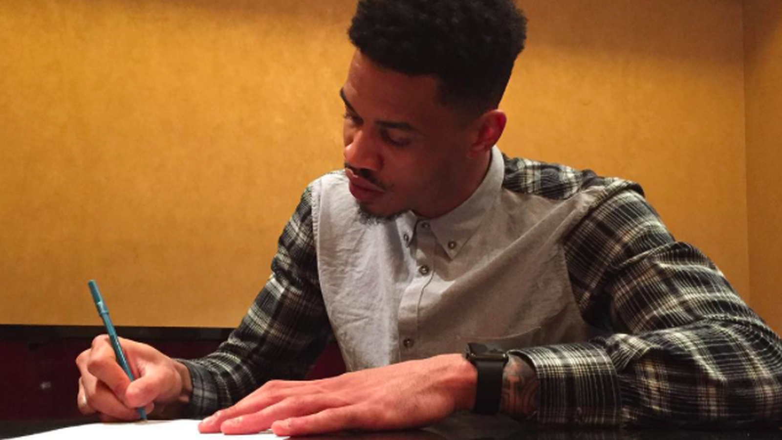 Description: A man sitting at a table writing on a piece of paper with a pen in his hand and a pen in his mouth.