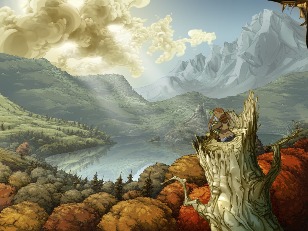 Description: A painting of a man sitting on a tree stump in a mountainous area with a lake and mountains in the background.