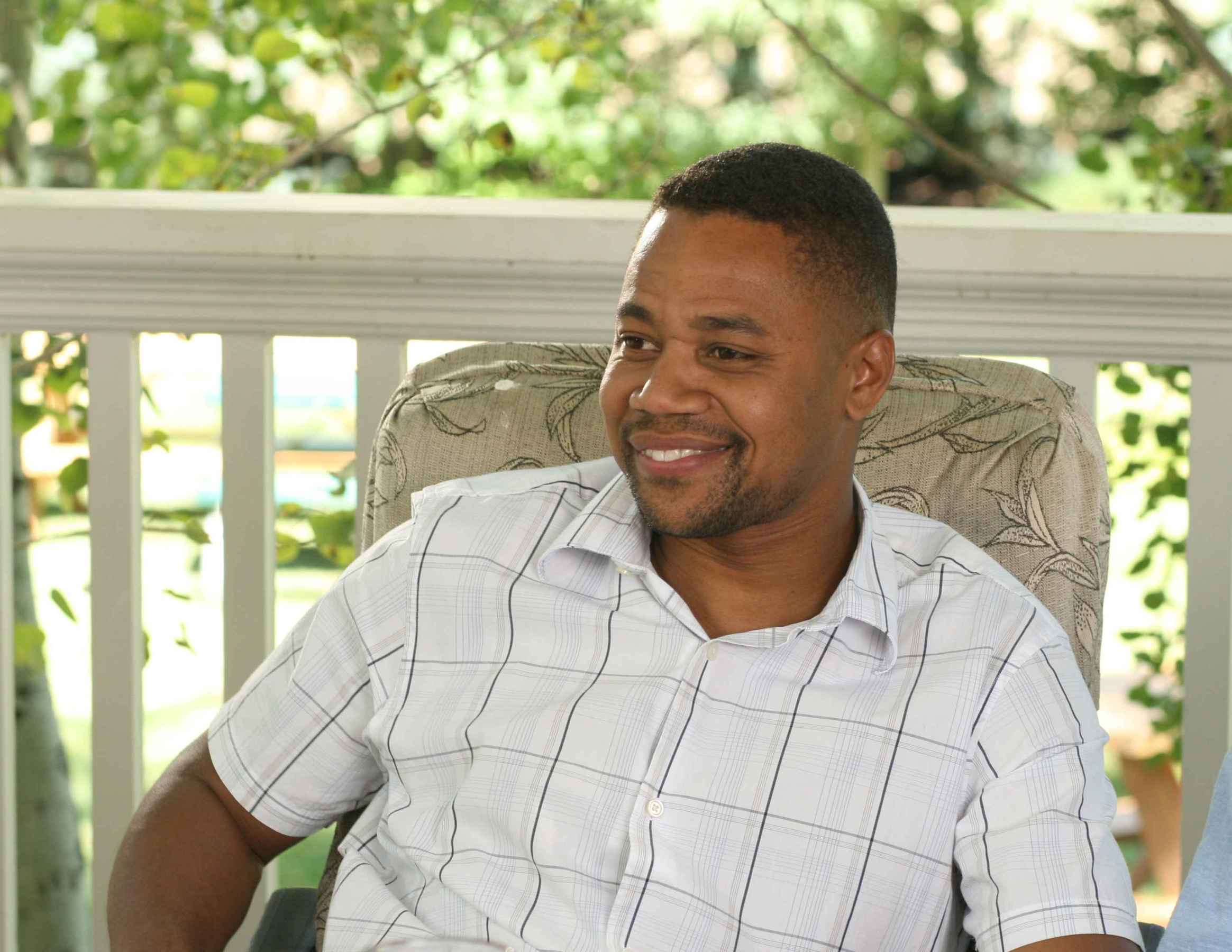 Description: A man sitting in a chair smiling for the camera with a smile on his face and a hand on his hip.
