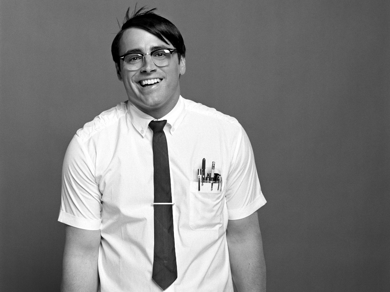 Description: A man wearing a tie and glasses smiling for the camera with a gray background behind him and a black and white photo of him.