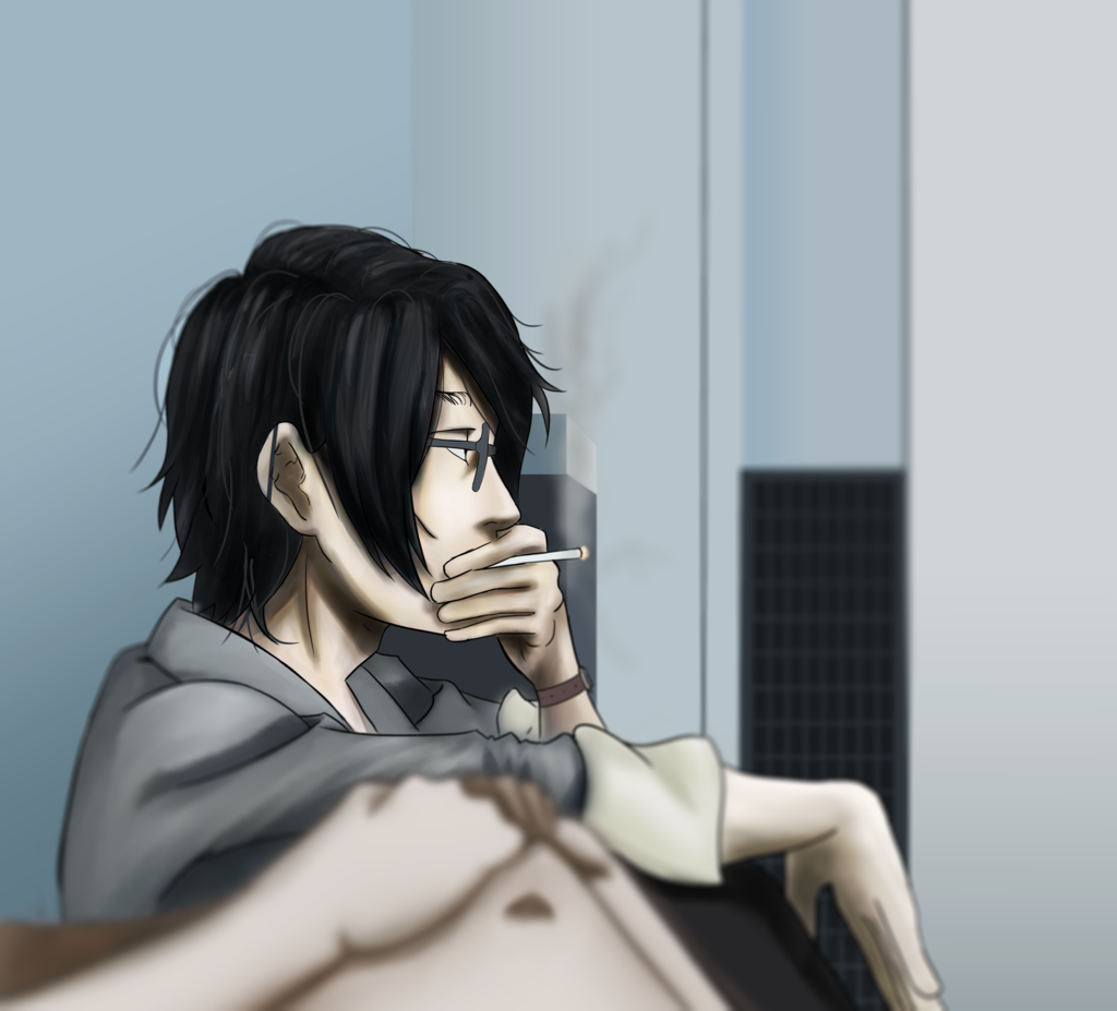 Description: A man smoking a cigarette in a room with a mirror and a window behind him.