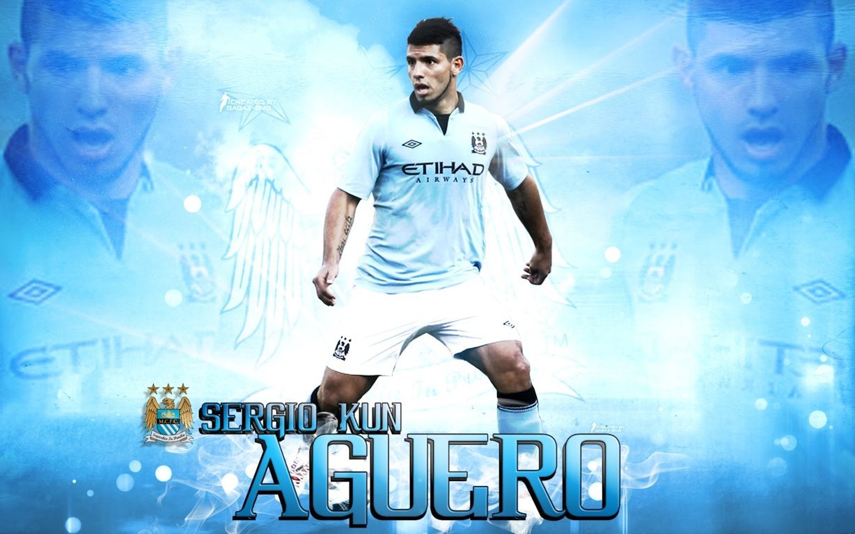 Description: A man in a soccer uniform is standing in front of a blue background with angel wings on it and the words severo kun aguero.