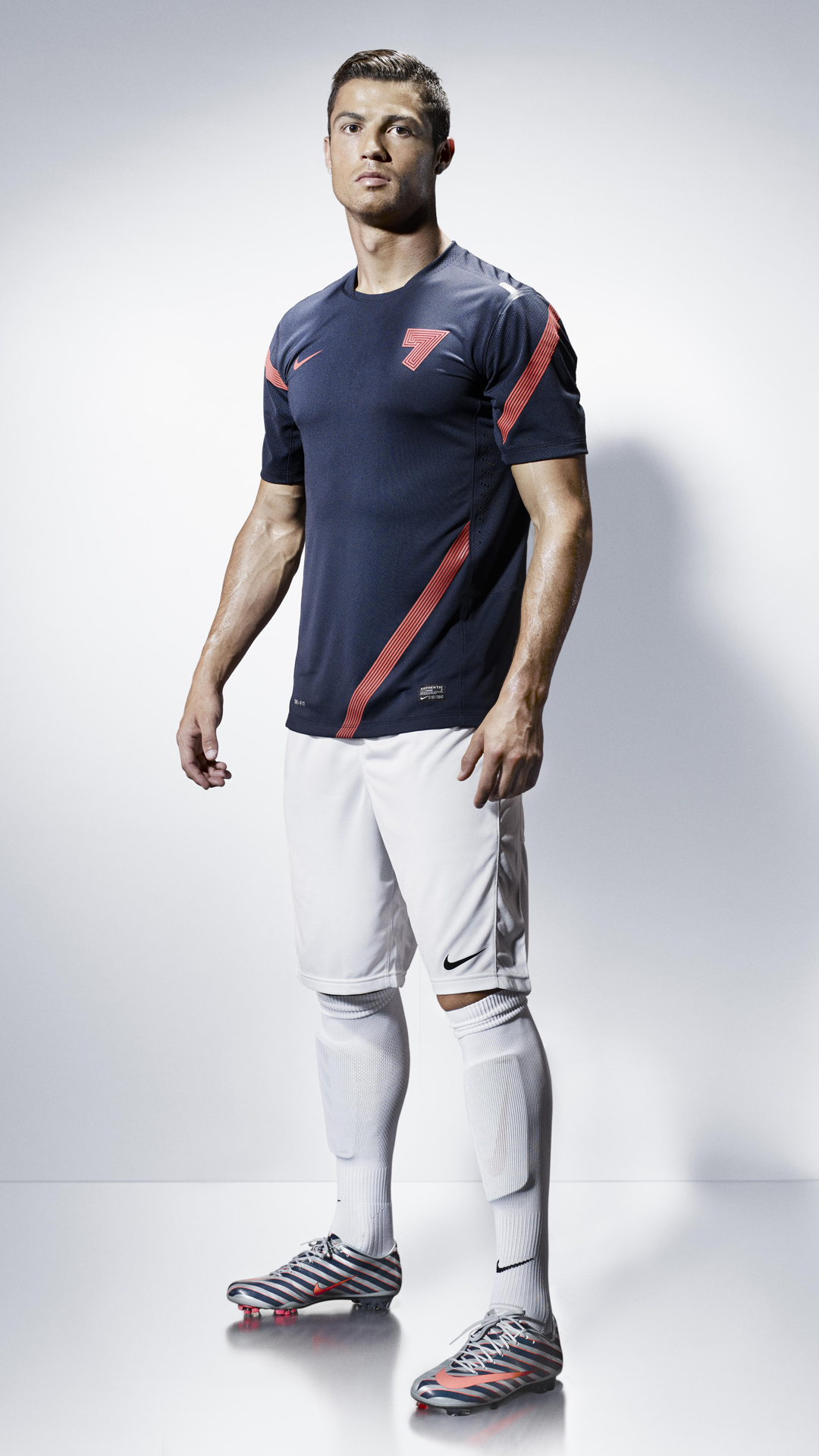 Description: A man in a soccer uniform posing for a picture with his foot on the ground and his head tilted.