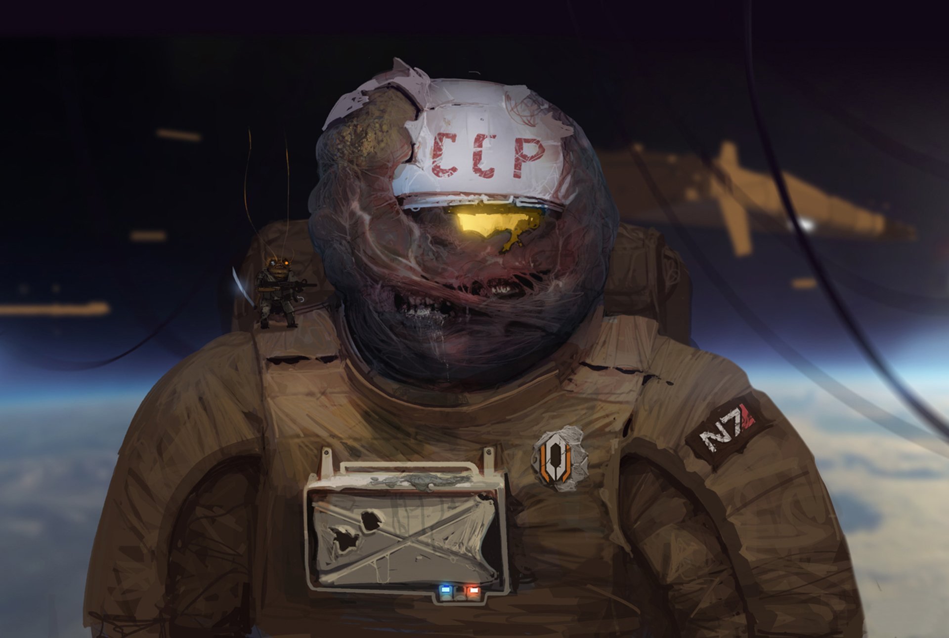 Description: A man in a space suit with a helmet on and a satellite in the background with a plane in the sky.