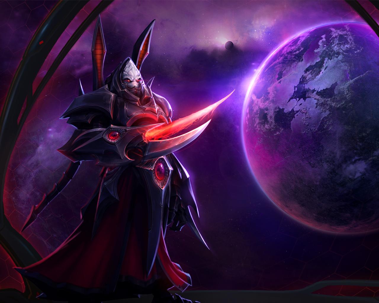 Description: A man in a space suit holding a knife in front of a planet with a purple glow behind him.