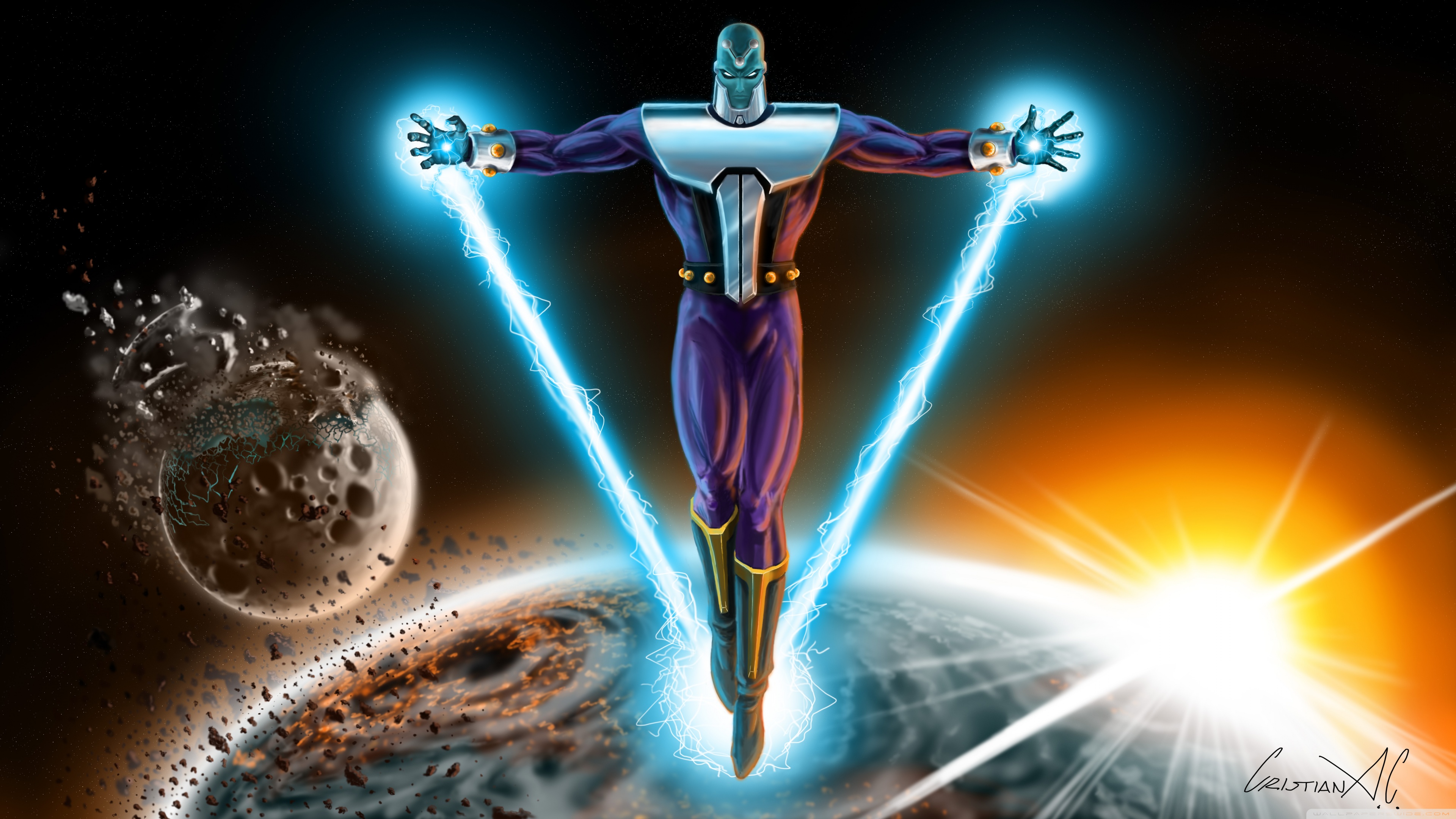 Description: A man in a space suit standing in front of a planet with a star in the background and a lightening bolt in the middle.