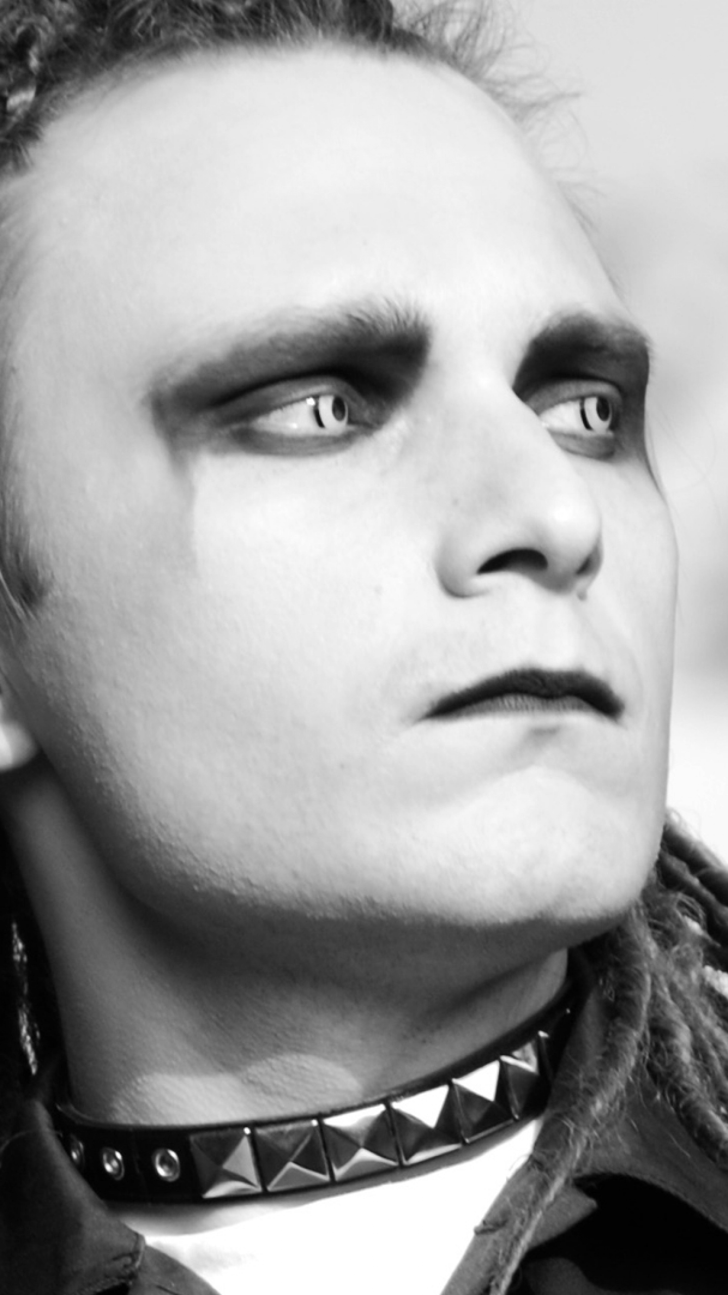 Description: A man with a spiked collar and a black leather jacket on his neck and a white shirt on his shirt.