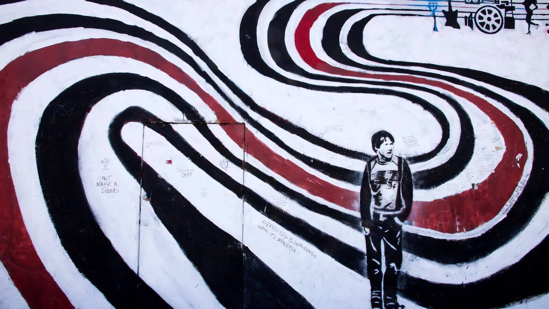 Description: A painting of a man standing in front of a wall with a spiral design on it and a car in the background.