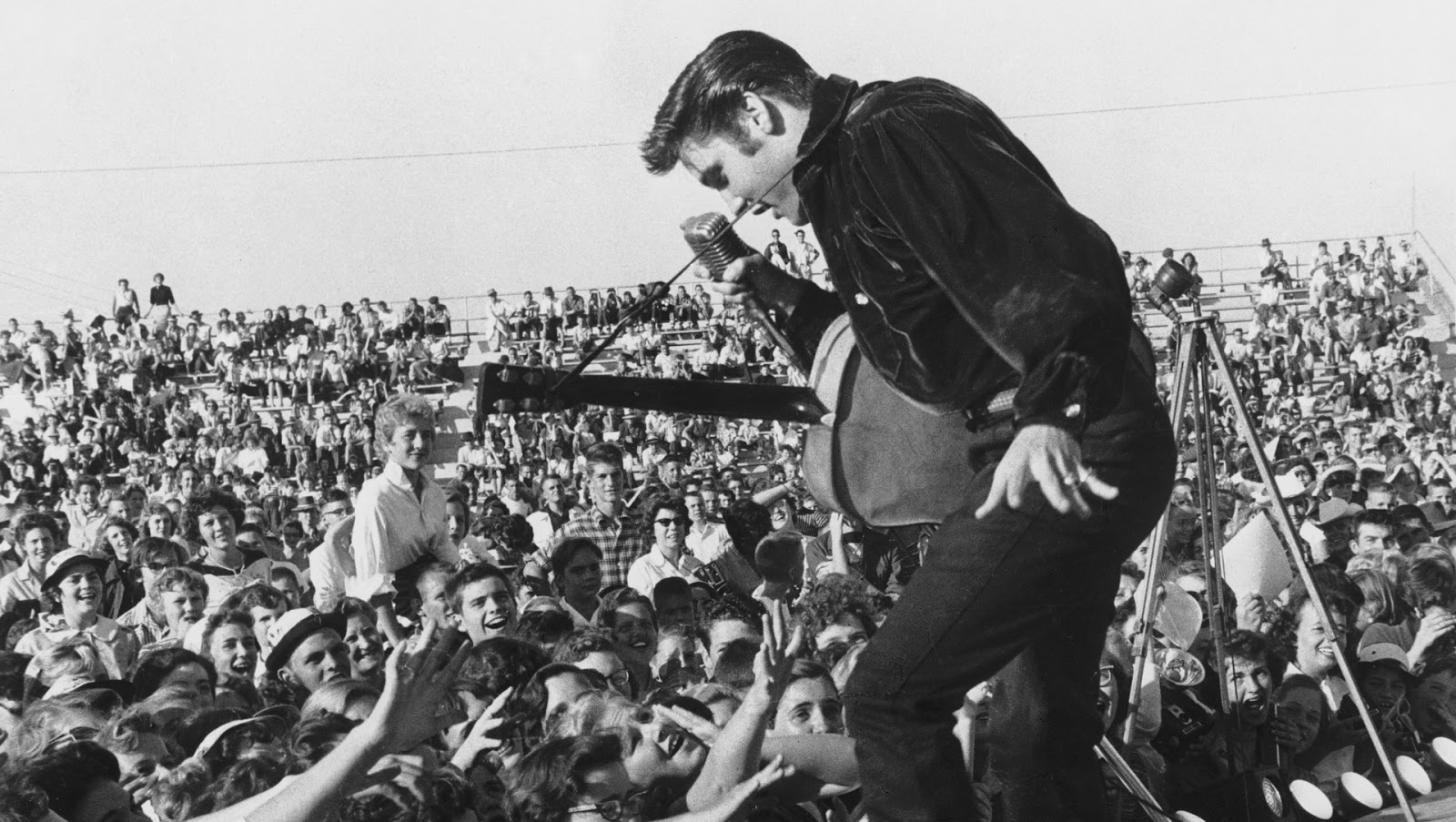 Description: A man standing on top of a stage in front of a crowd of people holding microphones in his mouth.
