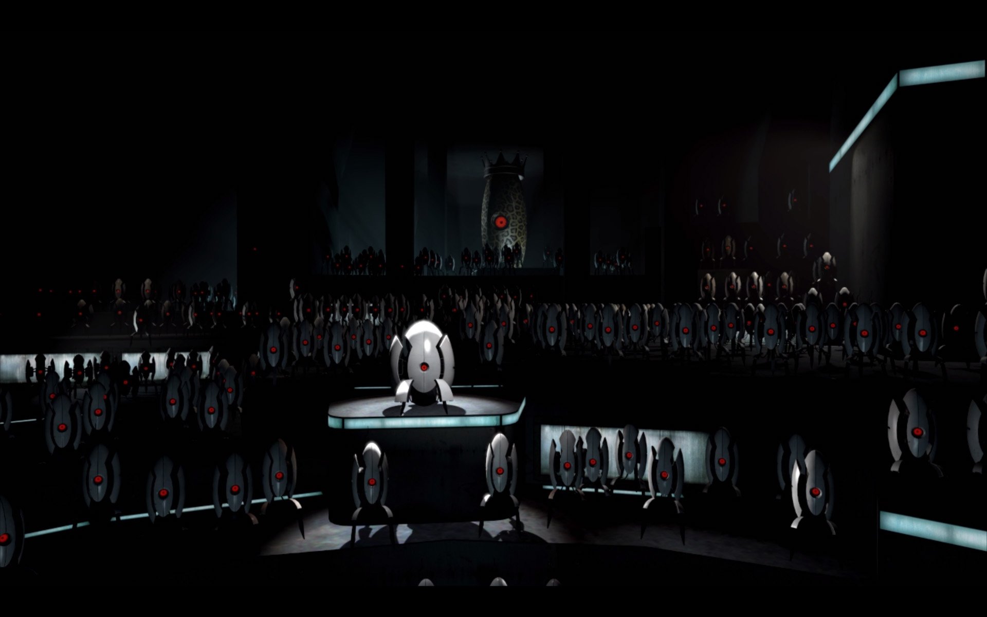 Description: A man standing on a stage in a dark room with a crowd of people behind him and a red light at the end of the stage.
