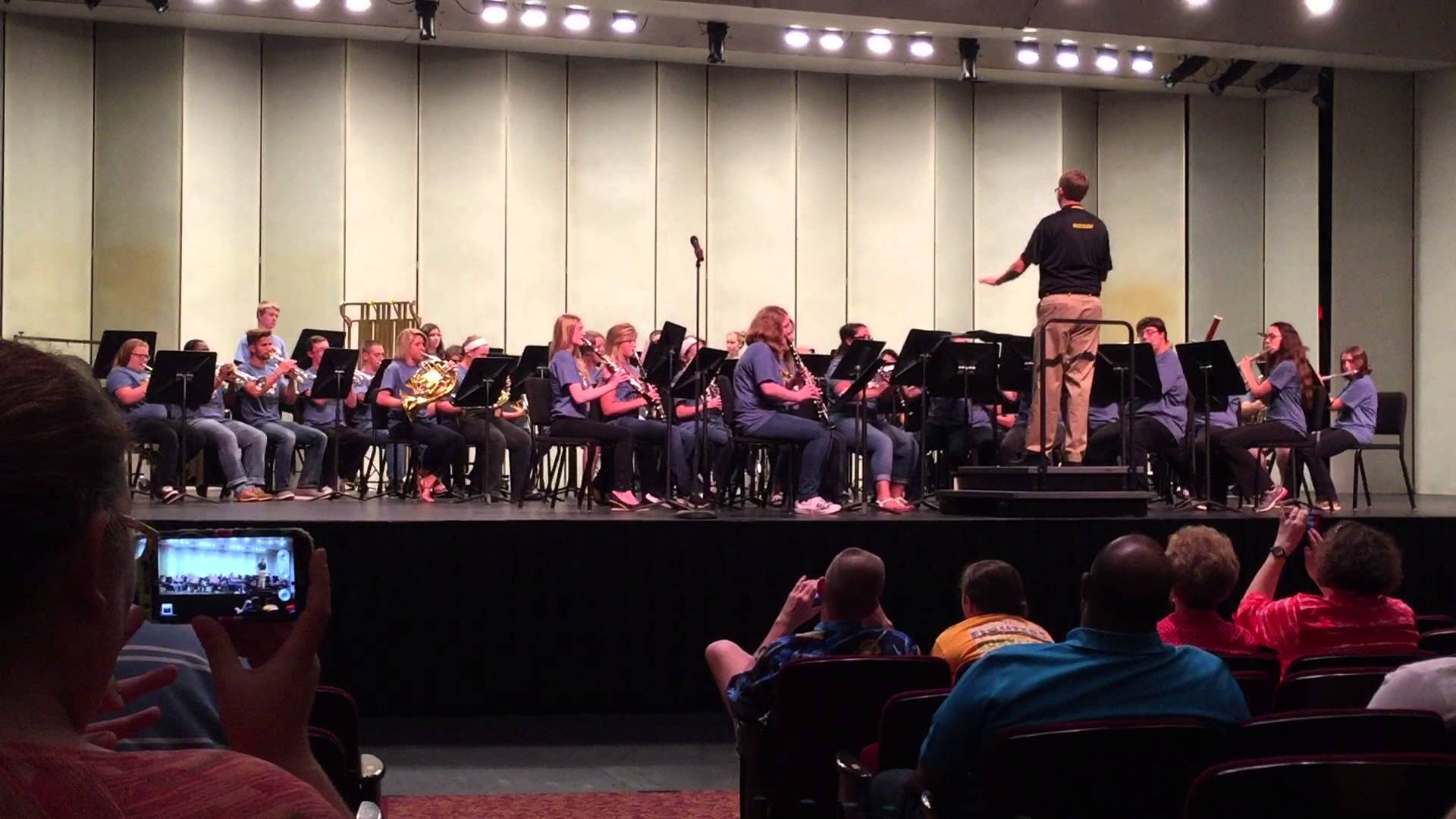 Description: A man standing on a stage with a microphone in front of him and a band of people behind him.