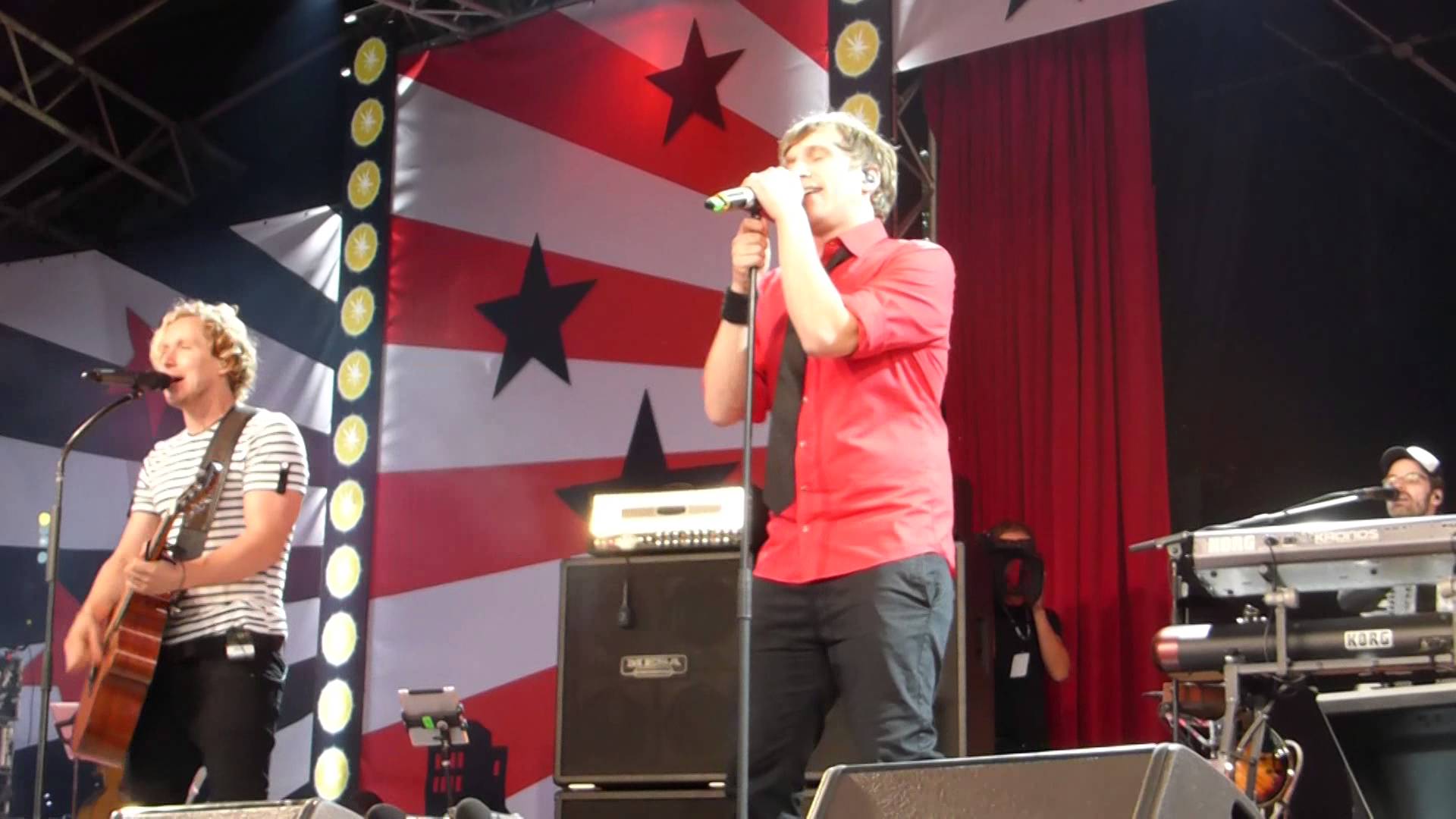 Description: A man standing on a stage with a microphone in his hand and a guitar in his other hand.