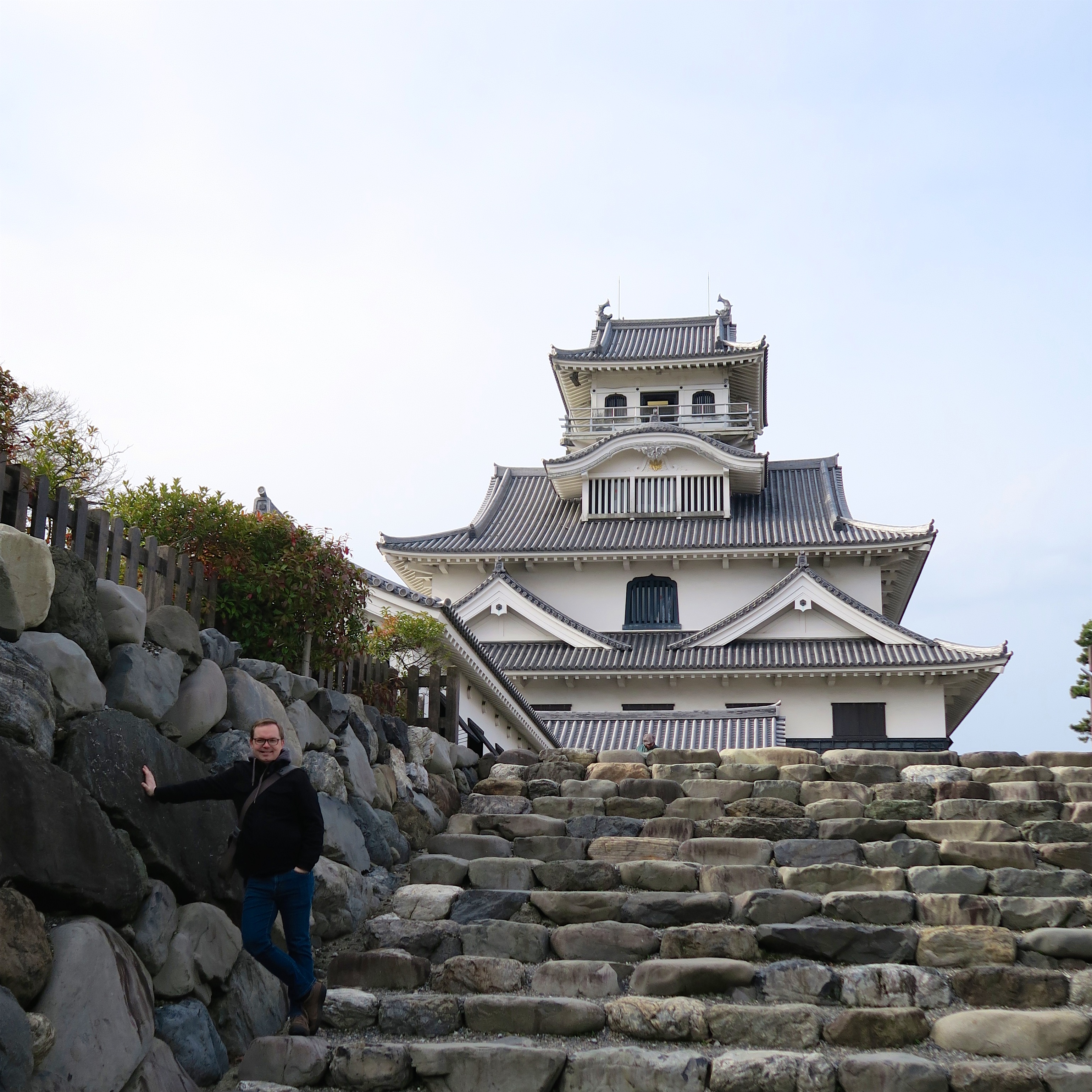 Description: A man standing on a stone stairway next to a building with a tower on top of it and a sky background.