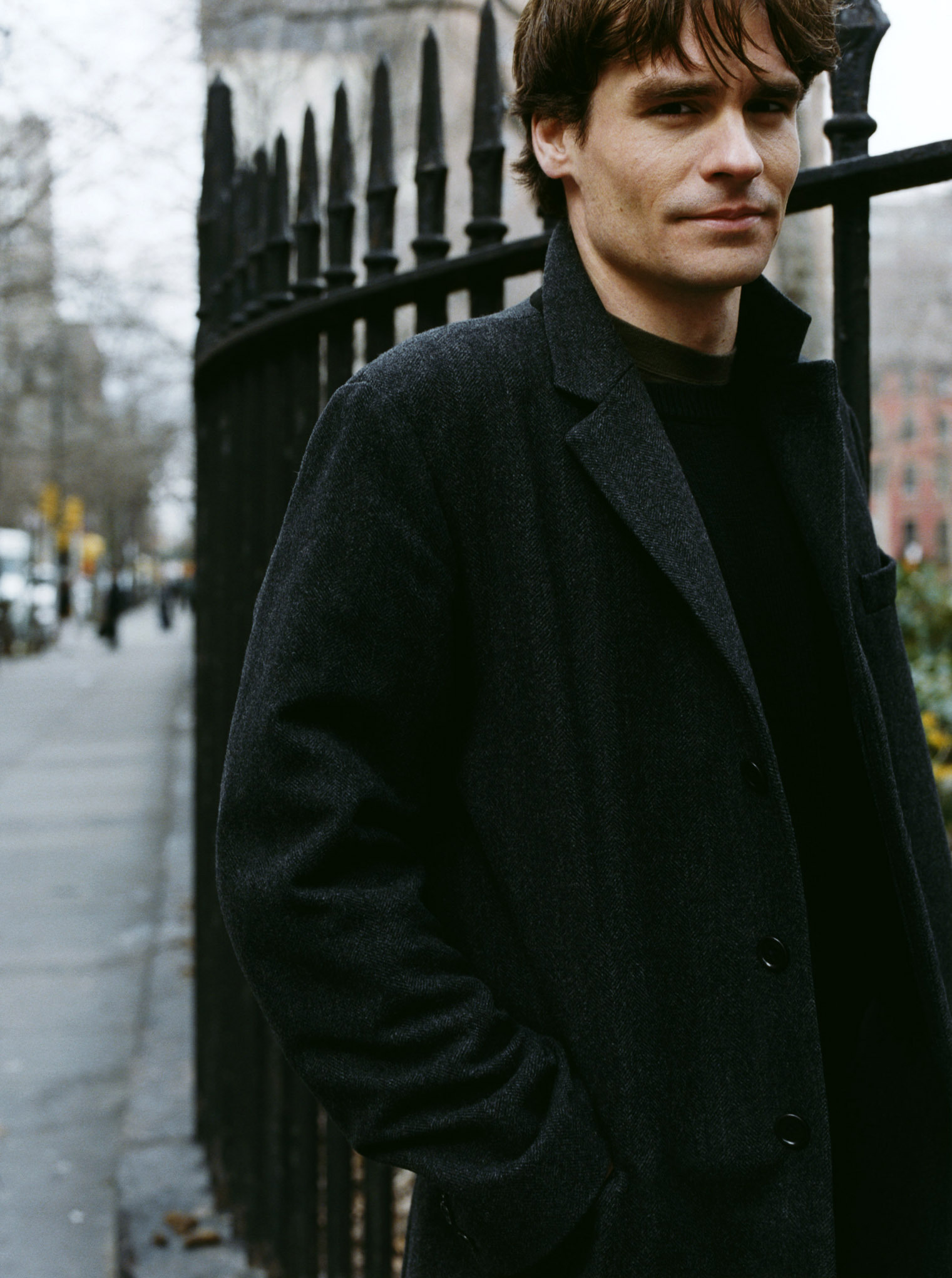 Description: A man standing next to a fence in front of a building with a clock tower on it's side.