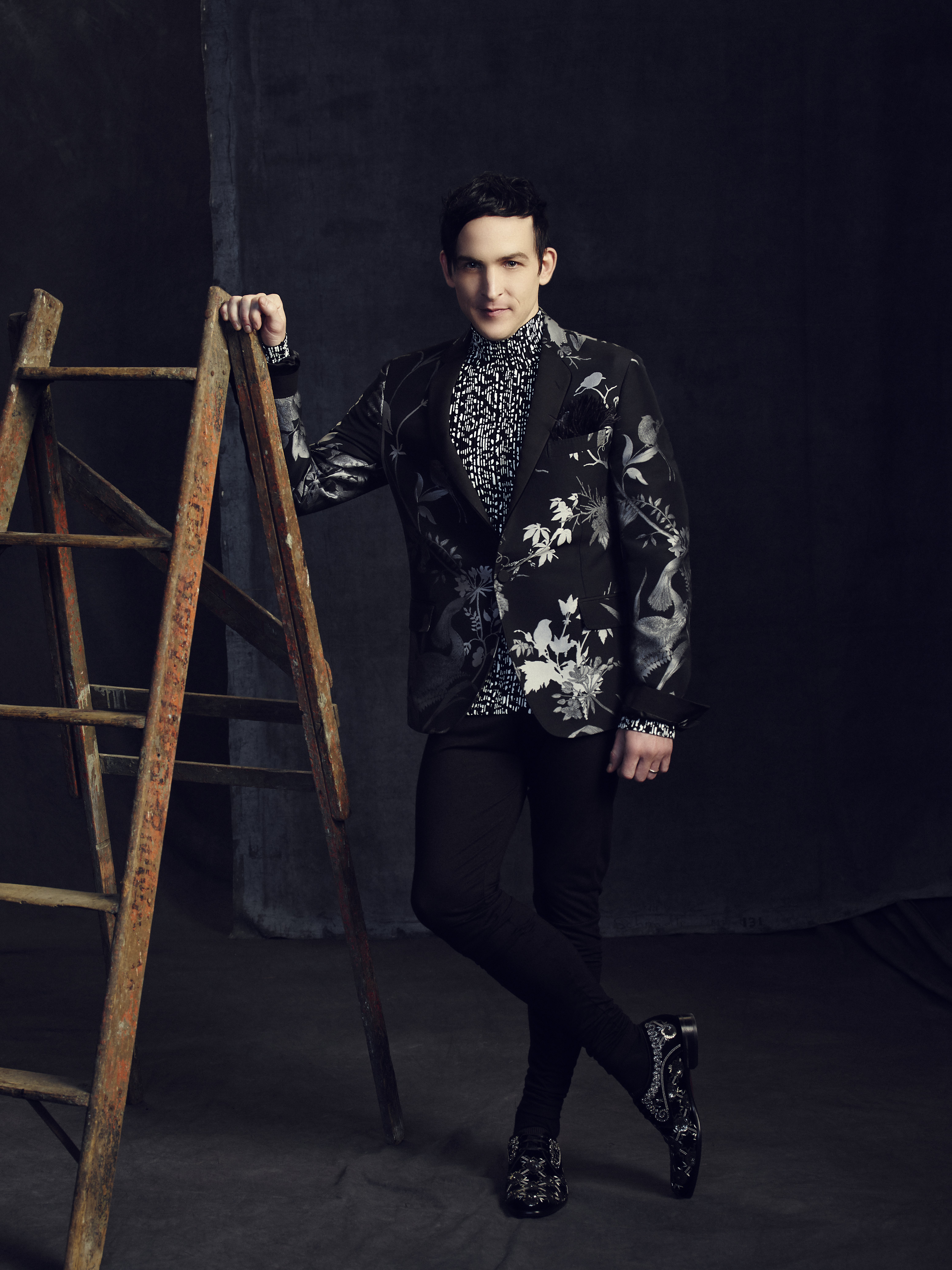 Description: A man standing next to a ladder in a black room with a ladder behind him and a ladder behind him.