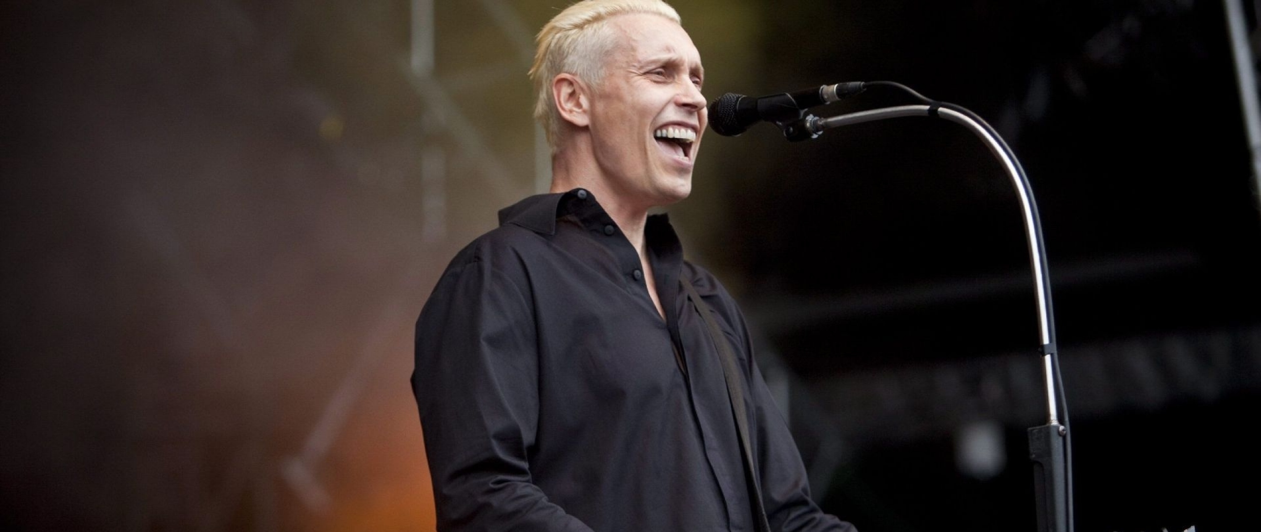 Description: A man standing at a microphone with a black shirt on and a microphone in his hand and a microphone in his other hand.