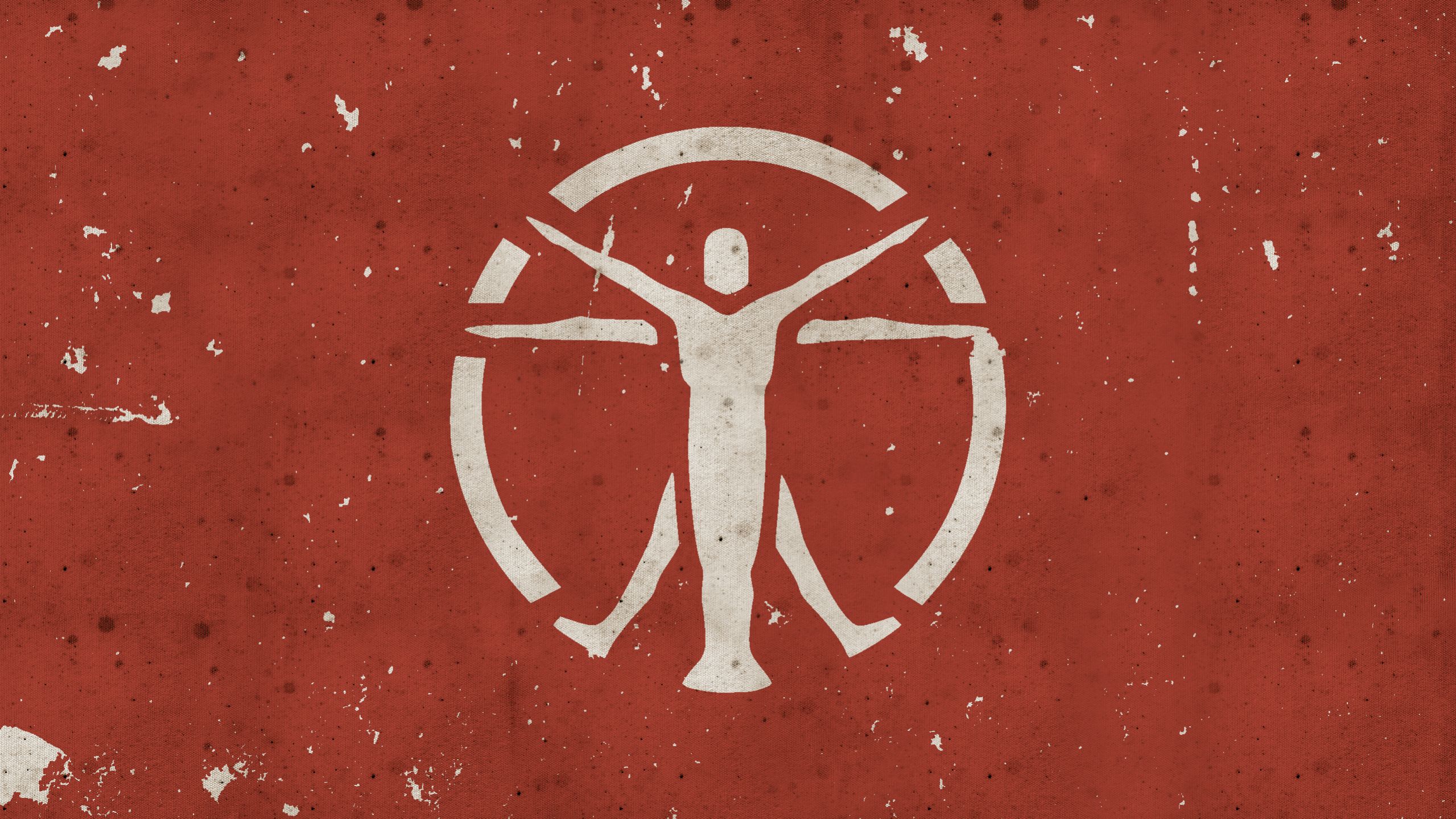 Description: A man standing in front of a red wall with a white symbol on it that says.
