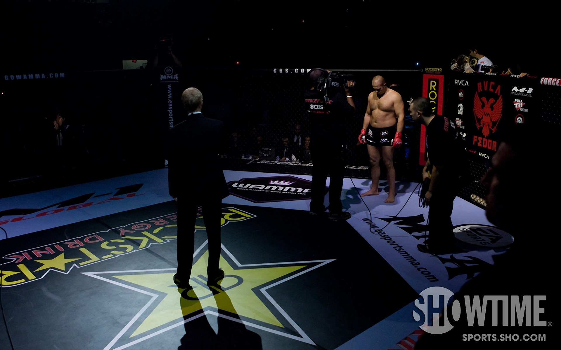 Description: A man standing in a ring with a star on the floor next to him and a man standing next to him.