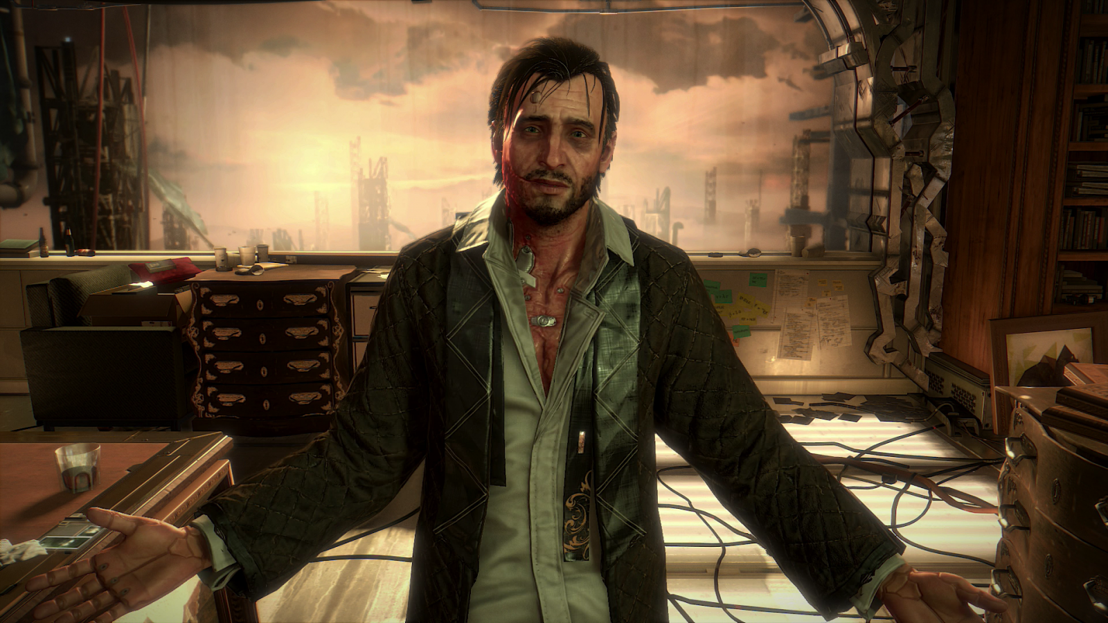 Description: A man standing in a room with a clock and a desk in front of him and a painting behind him.