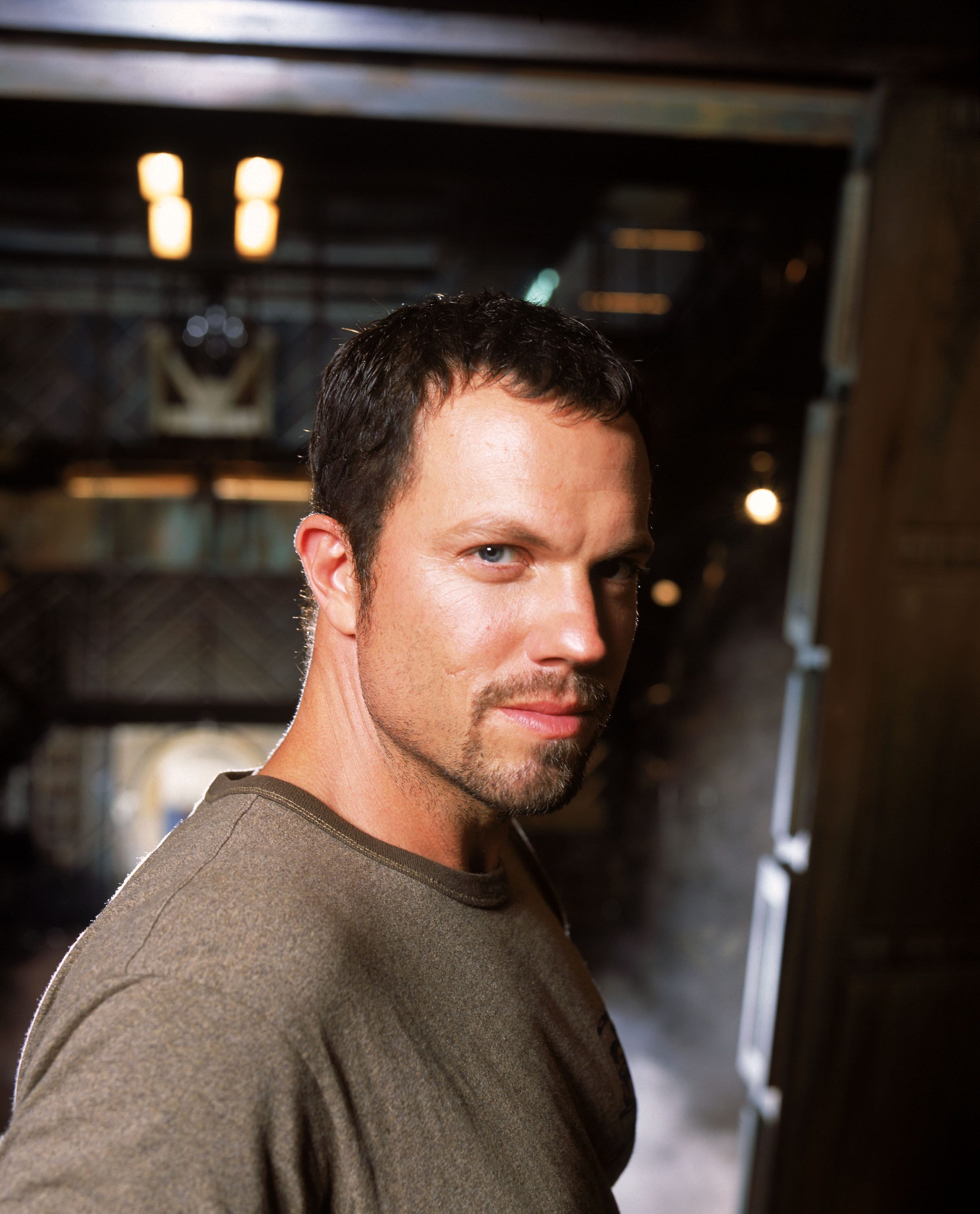 Description: A man standing in a room with a door open and a light on above him and a ceiling light above him.