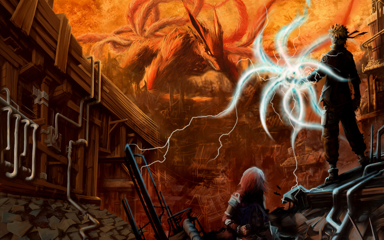 Description: A man standing on top of a pile of rubble next to a giant demon in a city with flames.