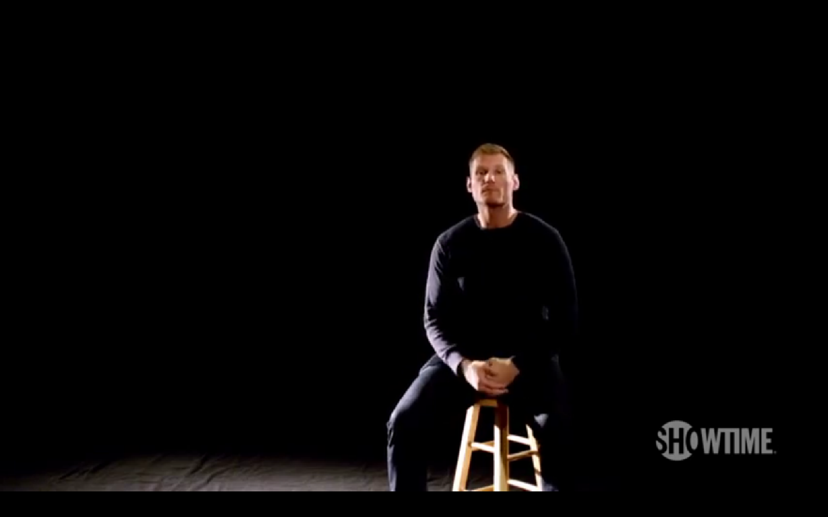 Description: A man sitting on a stool in the dark with his hands on his hips and his legs crossed.